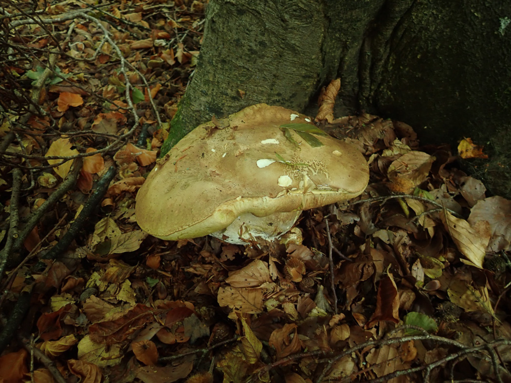 Oct 7, 2025. At the base of a Beech trunk in Gussetts Wood Penny could hardly miss this huge mushroom which must have been not far off a foot across! Turning it over revealed that two fruitbodies appeared to have merged together (or one had split apart) to form this monster, clearly one of the edible boletes. Geoffrey Kibby the next day named it B. reticulatus rather than B. edulis on account of the cap margin showing signs of reticulation (wrinkled and slightly disrupted) though the two species are (in Penny's view) not easy to tell apart. (They both taste delicious!) |