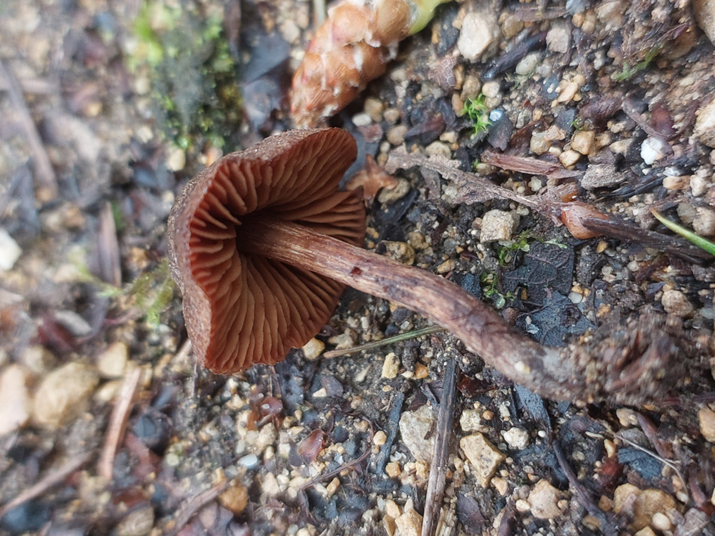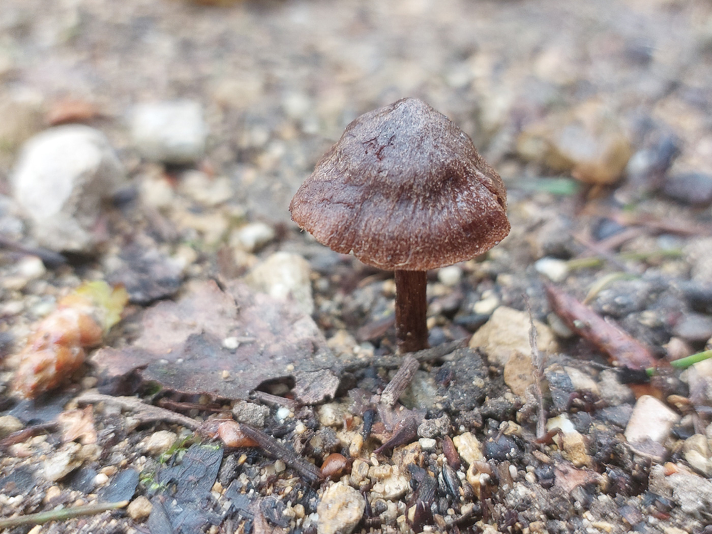 May 27, 2022. In Stoke Common Penny had to search long and hard to find any fungi today, it was still incredibly dry underfoot (though near the Bucks/Oxford border there'd been considerable rain recently). In the dried up bed of a pond she found this rather nibbled small singleton, still with somewhat pale gills for a genus which has dark brown spores but a few hours later they were becoming suitably brown. This common species often fruits very early in the season in grassy path edges in woodland (so appearing in muddy soil which is usually under water seemed odd?). |
