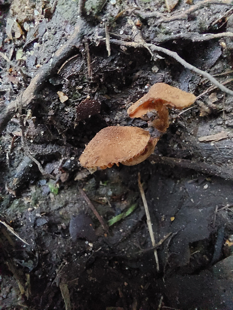 Feb 26, 2026. In soil in a roadside bank between Little Chalfont and Chalfont St. Giles, Jesper Launder spotted these LBJs which appeared very similar to a collection of Flammulaster ferruginea he'd found recently in very similar habitat (see the Feb 18th entry). Working on these at home revealed some important differences from that collection, both macro and micro. The cap surface was granular (visible in photo 2) and lacked the striations seen previously, furthermore the cells in both the cap cuticle and gills were different, making this F. granulosus - a species with only one previous county record from 2008 though not that rare according to FRDBI. |