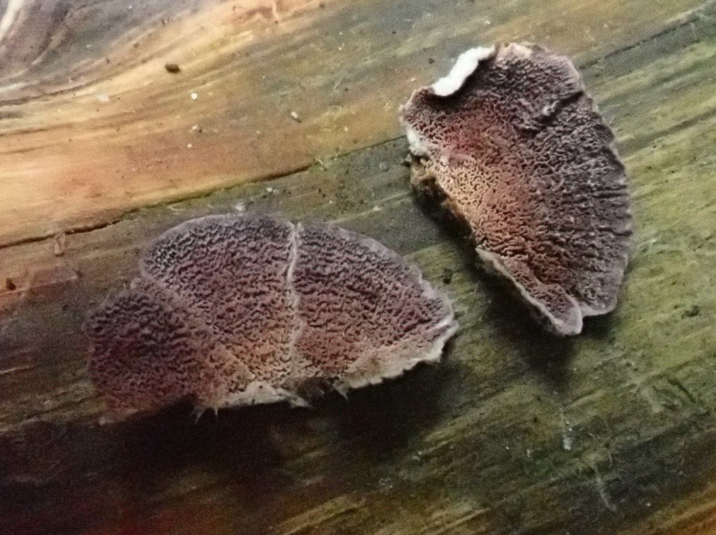Nov 7, 2020. On the quantities of felled Pine at Stoke Common Penny C. found this species everywhere. It forms large colonies of small whitish hairy brackets (only on fallen conifer) and the underside has violet purple pores, hence its common name. Do not confuse with the somewhat similar Chondrostereum purpureum (see photos and notes dated Nov 06, also today as well) which from above is almost identical but the underside, though purple, is smooth and not pored as in today's species. It occurs on deciduous wood, commonly Birch, never conifer. |