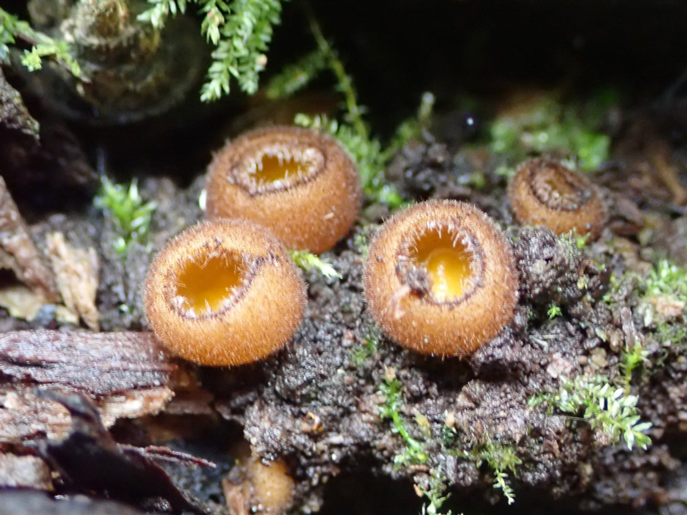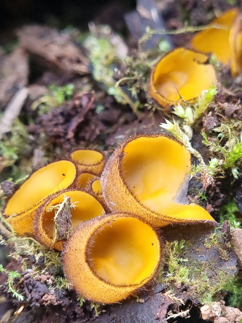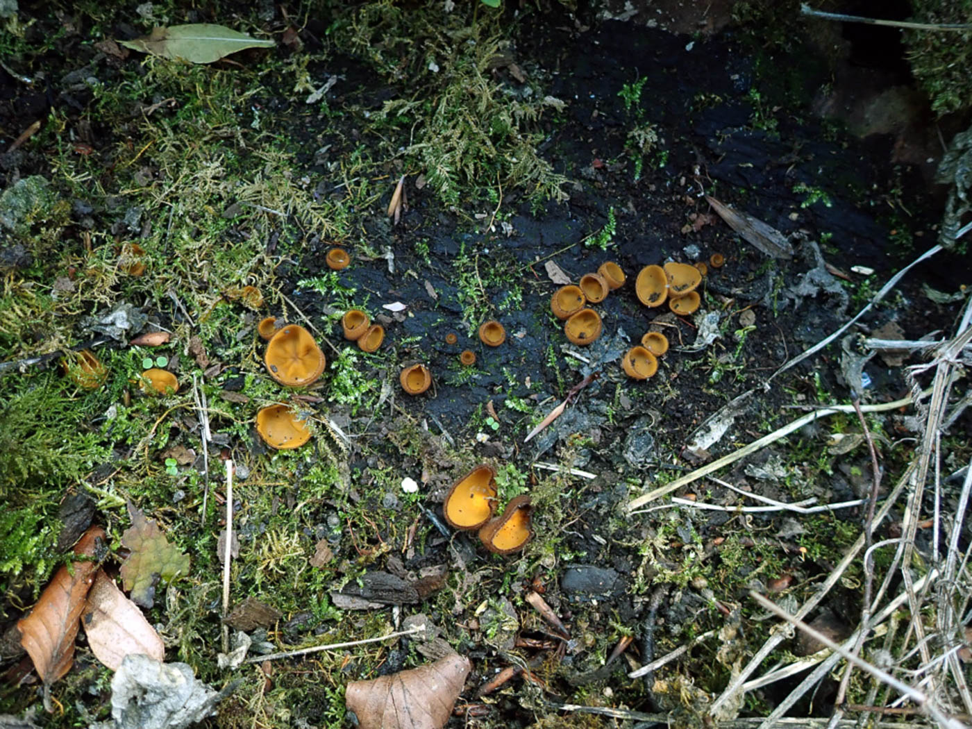 September 21st Aurantiolachnea solsequia (Orange Glazed Cup) 10 days earlier Mick Jones had alerted me to the fact that this rare and beautiful cup fungus, new to the UK when we found it here in 2022) was up and fruiting again (photos 1 and 2). So a small group of us, keen to see it again, enjoyed this stunning species today – together with some other interesting species. It was on an old rotting Cherry trunk on the same bank where we'd first found it and in quite good numbers too. What is so remarkable is that this distinctive species - hardly mistakable for anything else - should still apparently have gone unnoticed anywhere else in the UK. It is not one of your tiny little ascos and when fully open is around 2-3 cms across, also it seems to fruit quite plentifully and the substrate is not unusual. Previous finds |