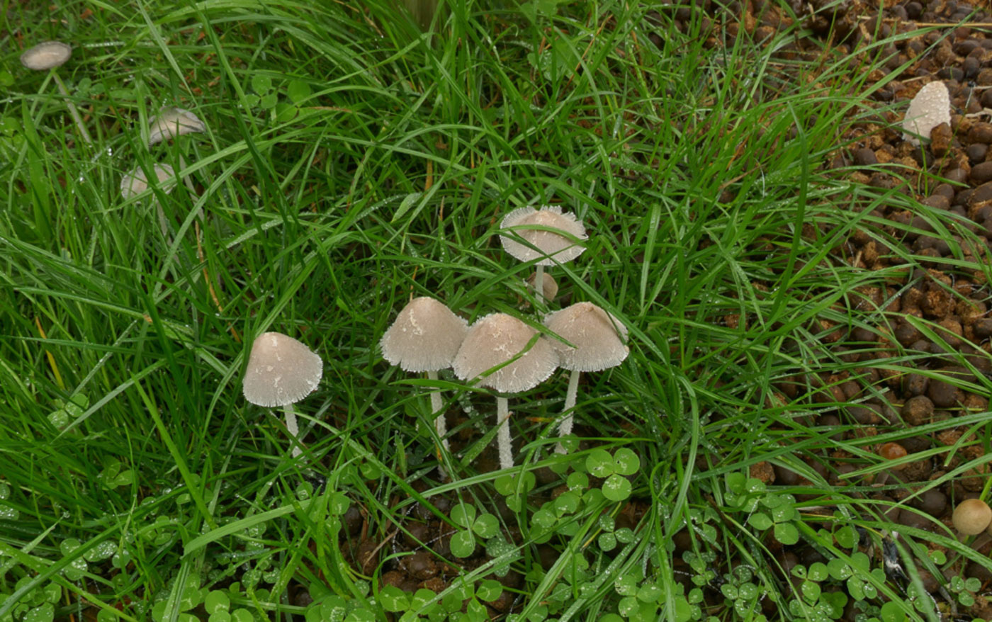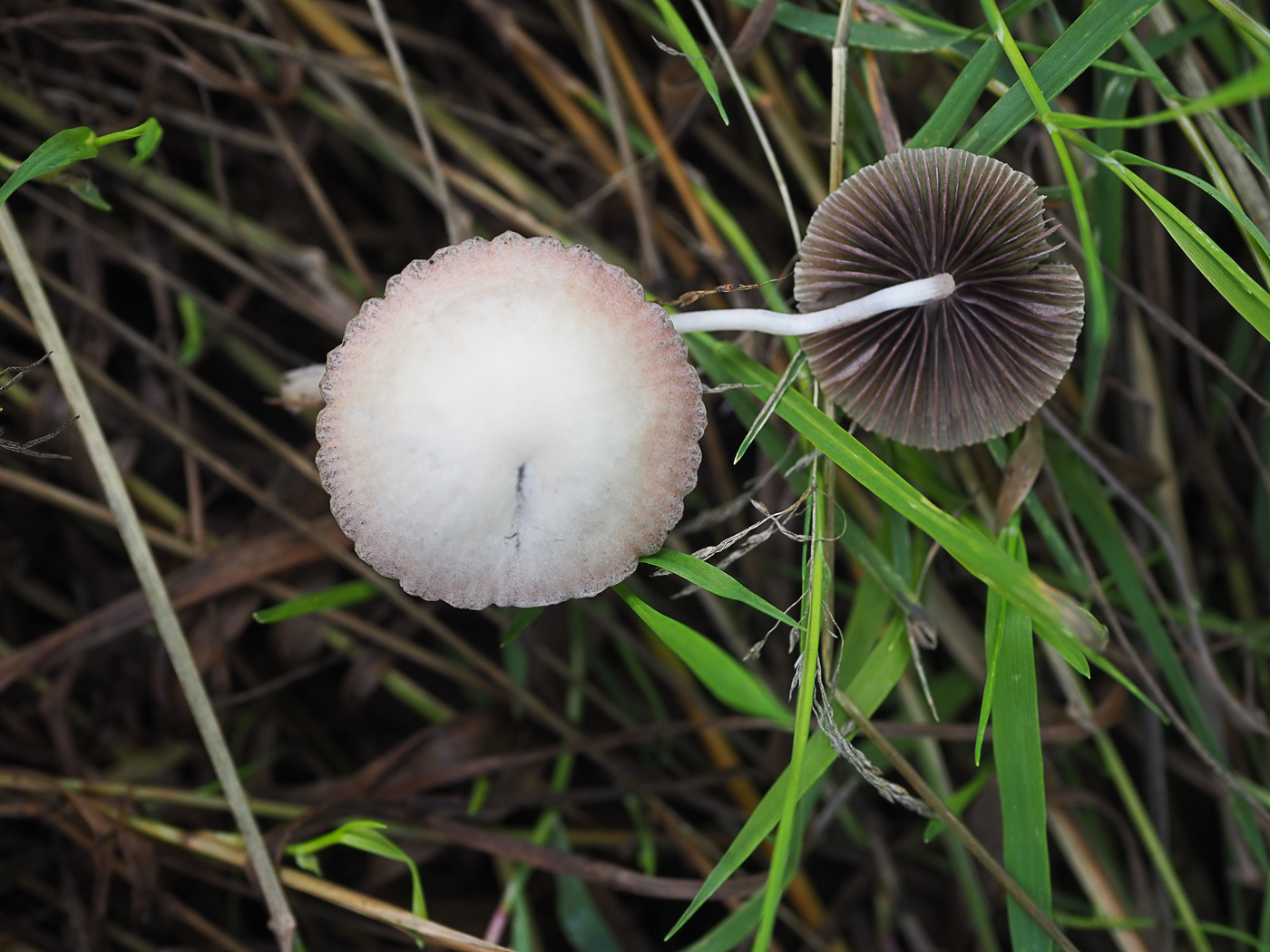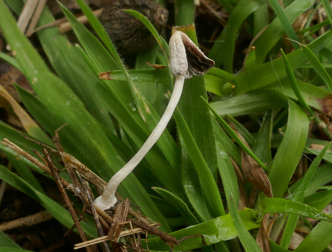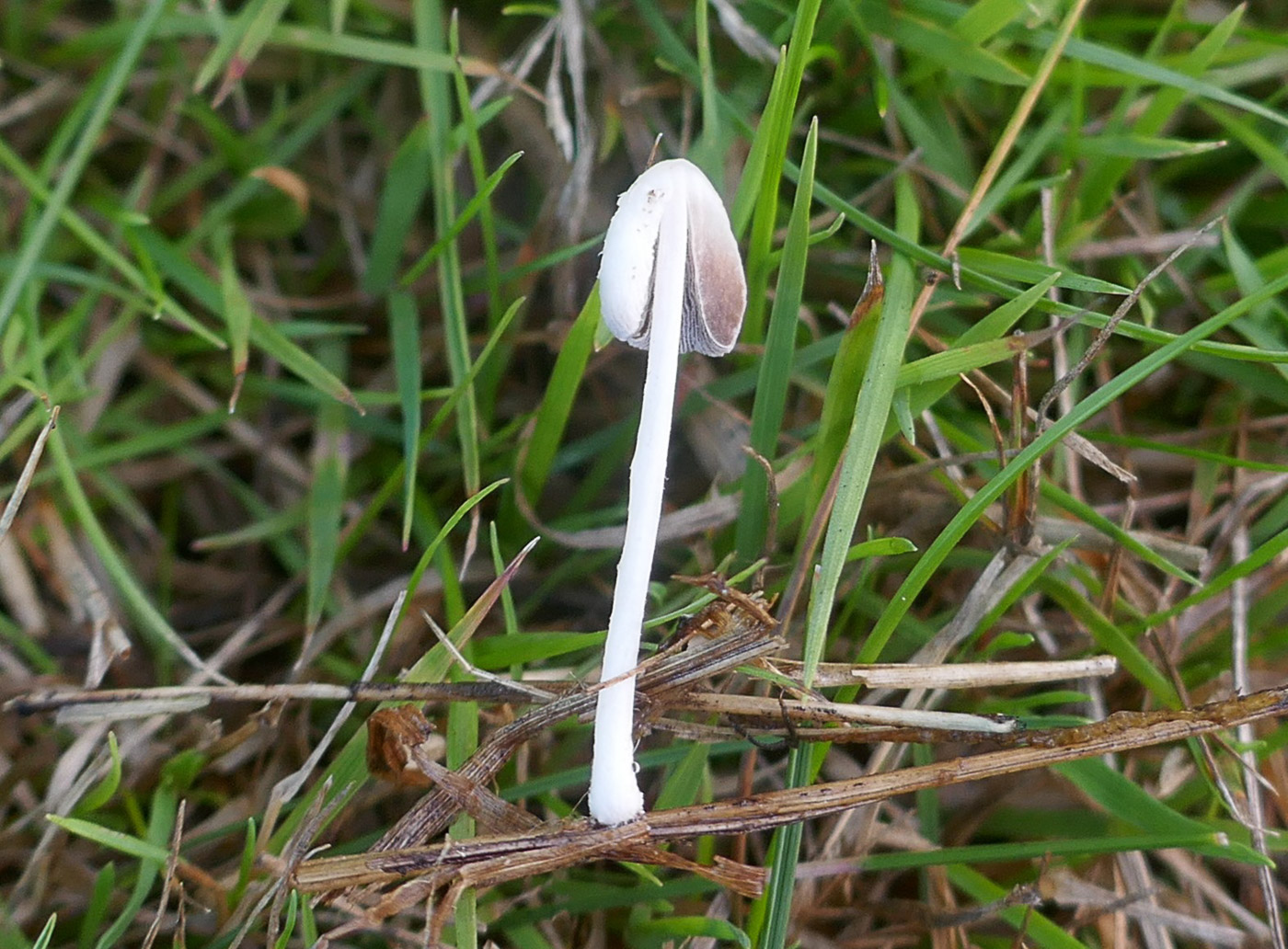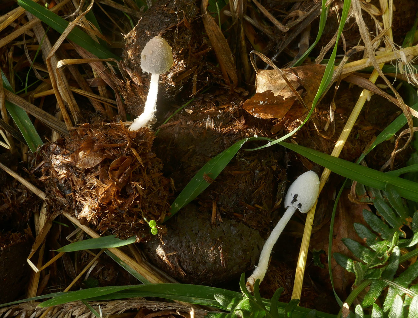September 17th Coprinopsis pseudonivea (Aromatic Inkcap) At Stampwell Farm Jackie Ewan finds this species quite often on the donkey dung heap but here in the goat paddock it was not only larger but obviously happy associating with goat dung. The pinkish tint of this species when young and fresh is showing well here leaving no doubt that it is not the similar but pure white C. nivea (Snowy Inkcap) Previous finds |