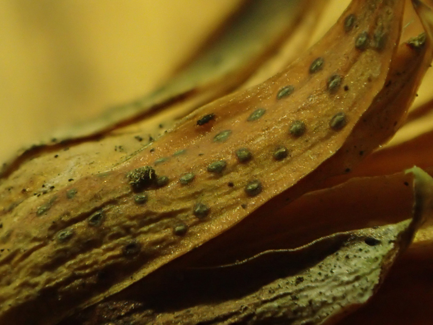June 6th Puccinia iridis a species of rust with no English name Jesper Launder spotted this rust on the leaves of Iris foetidissima (Stinking Iris) in a roadside verge in Jordan Village. This species occurs on several species of Iris, having its initial stage on Urtica (Nettle). Though not at all rare we have only one previous Bucks record made by Derek in his Whitchurch garden in 1999, reflecting the lack of BFG recorders for such species. New find |