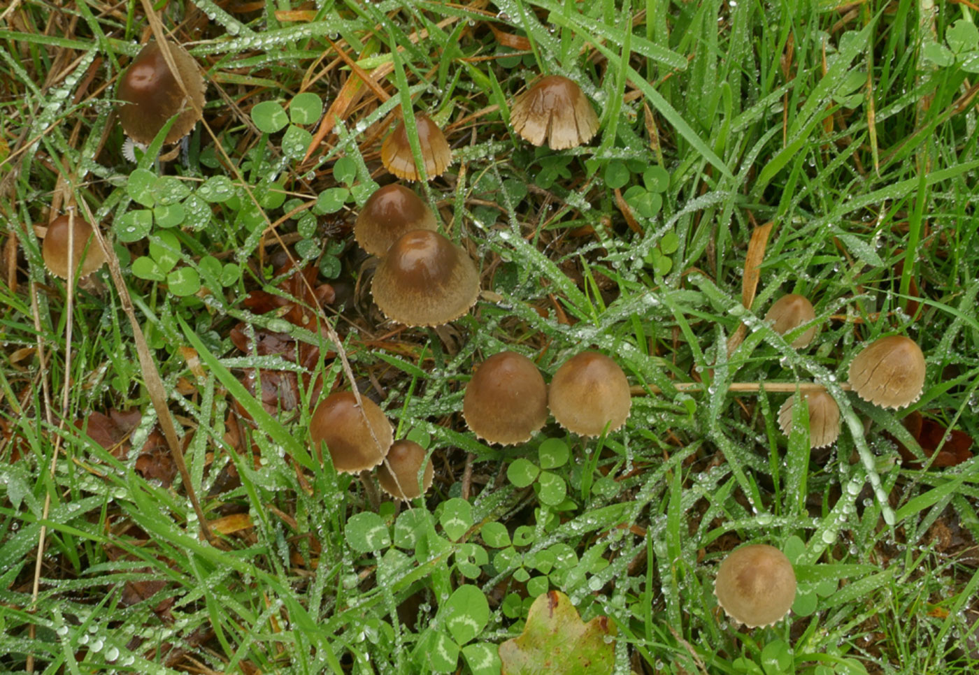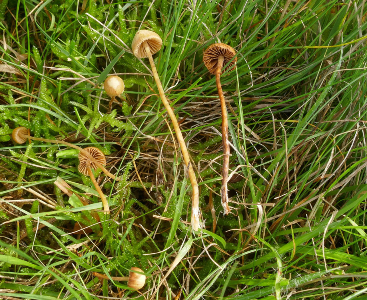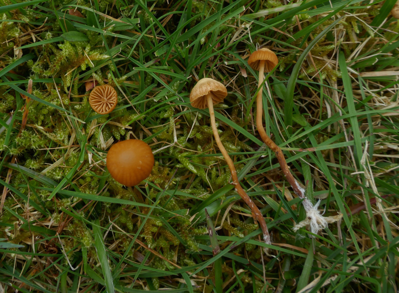 September 18th Galerina variibasidia (a rare Bell with no English name) ![]() At Stampwell Farm this particular species has been found in this grassy path by Jackie Ewan before though not identified despite Jesper examining it last spring, also DNA sequencing which sadly failed. So Jackie, determined to try and get further with it this time, searched online and came across details of two UK collections of a species described from China in 2021 which were confirmed with sequencing at RBG Kew and matched her find perfectly even to growing on the moss Rhytidiadelphus squarrosus. So this was good detective work and is a new county record and presumably also the 3rd UK record. Photo 1 shows today's collection and photo 2 is last year's, the same moss being clearly in evidence. New find |