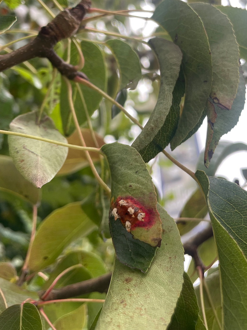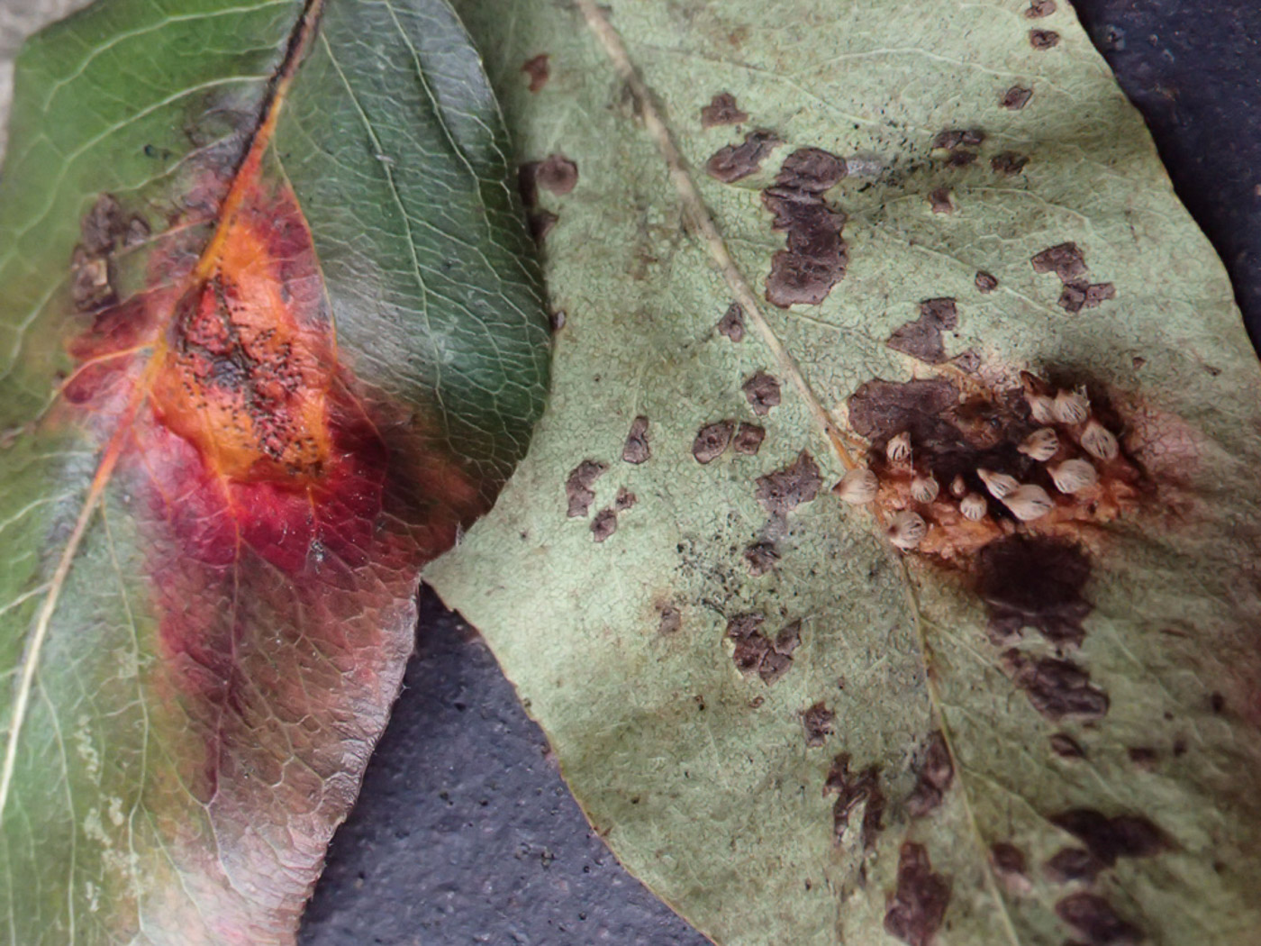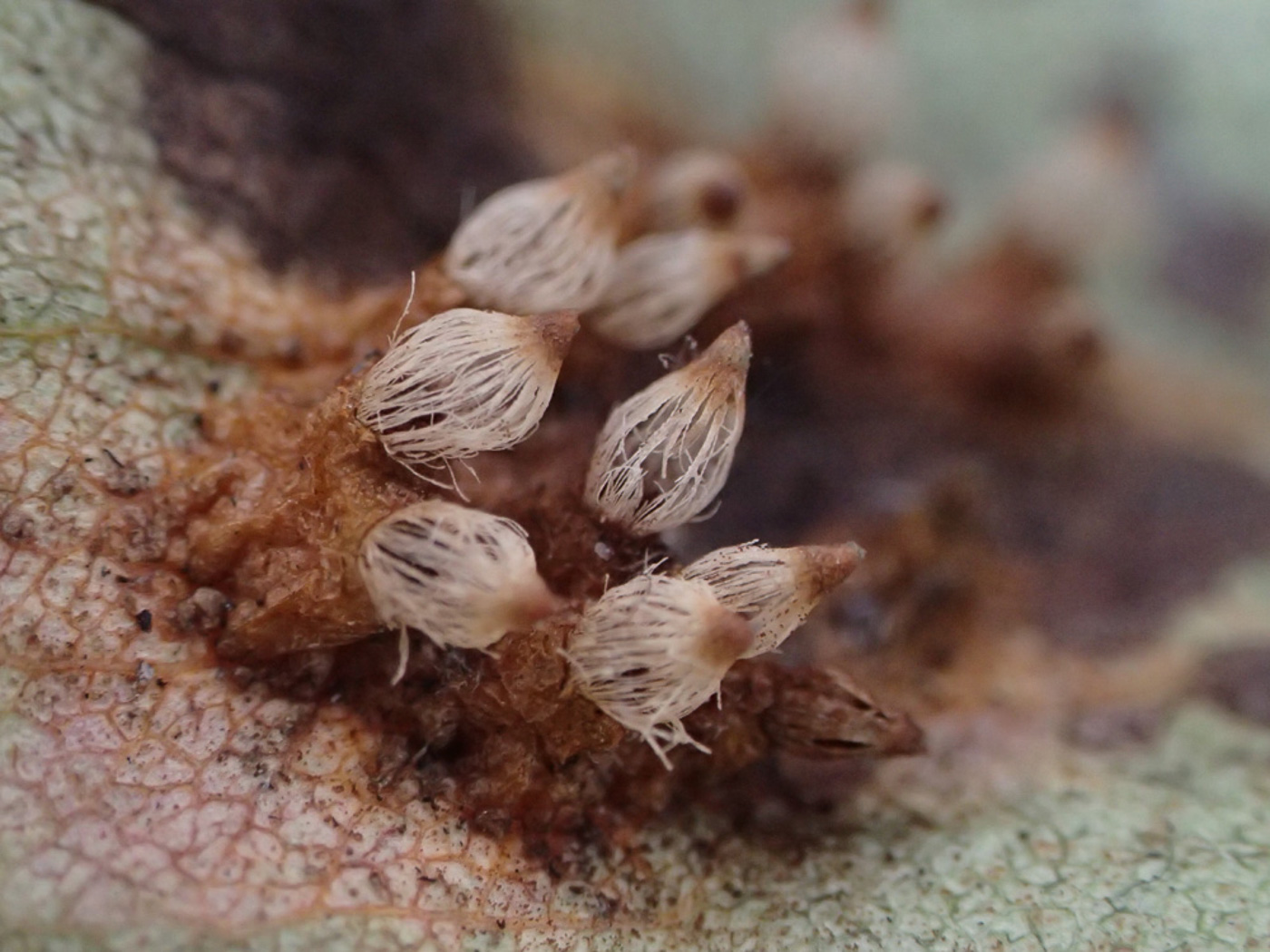 September 17th Gymnosporangium sabinae (Pear Rust) ![]() On a Pear tree on the roadside near Amersham Station Sarah Ebdon noticed these tiny 'Chinese lanterns' forming on the underside of the leaves and recognised them as the spermogonial stage of this particular species of Gymnosporangium where the swollen 'galls' open out to release spores through the longditudinal slits in the 'lanterns' which are seen here. (Sarah didn't notice the alternative host Juniper - presumably a cultivated variety in this urban area - but it must have been there somewhere near for this fungus to be occurring on the Pear. She'll be back to locate it next year, no doubt, and hopefully get photos of the earlier stage on Juniper. Neil Fletcher's previous photos in Finds show these lanterns just beginning to develop. Photo 1 here shows the aecial stage, photo 2 this stage on the upper leaf surface and the spermogonial stage on the underside, photo 3 shows the 'lanterns'! Previous finds |