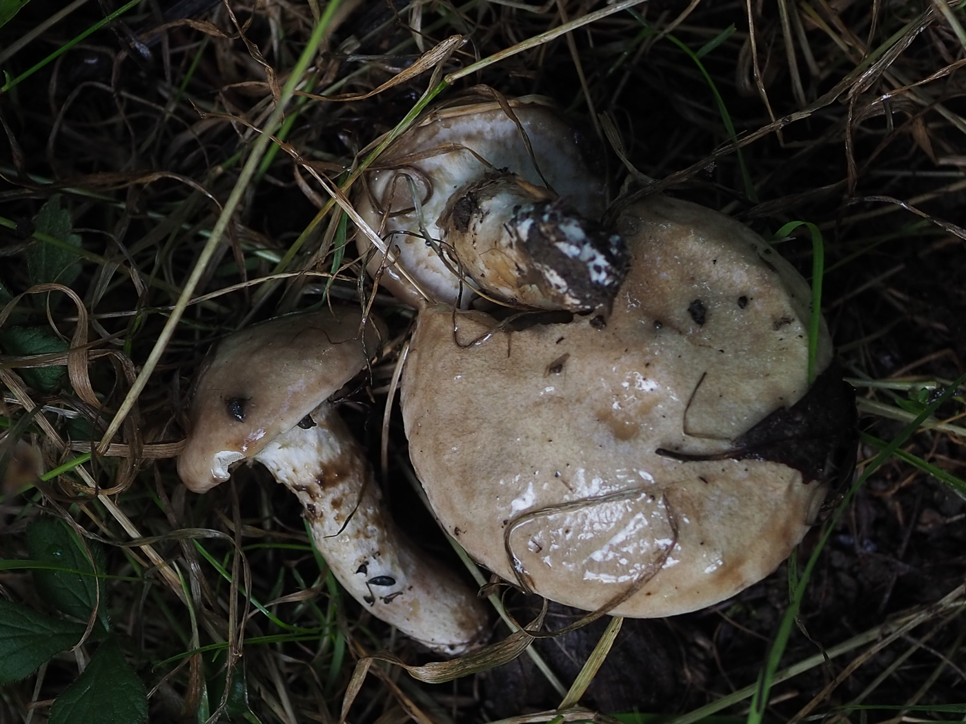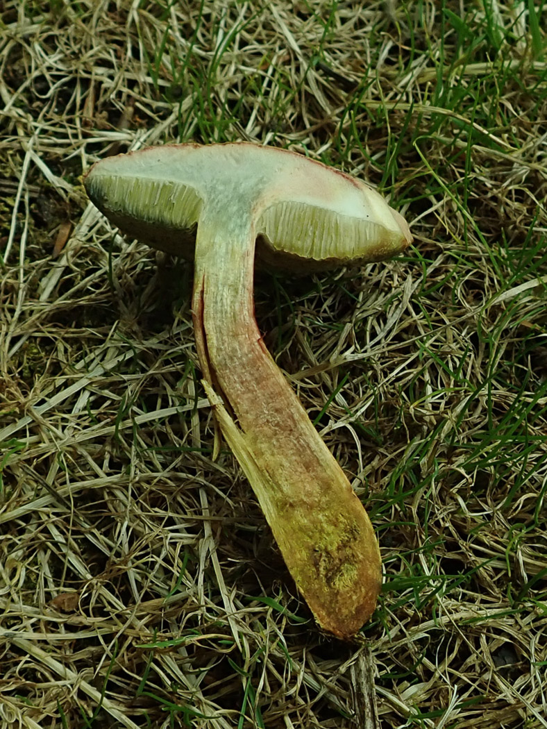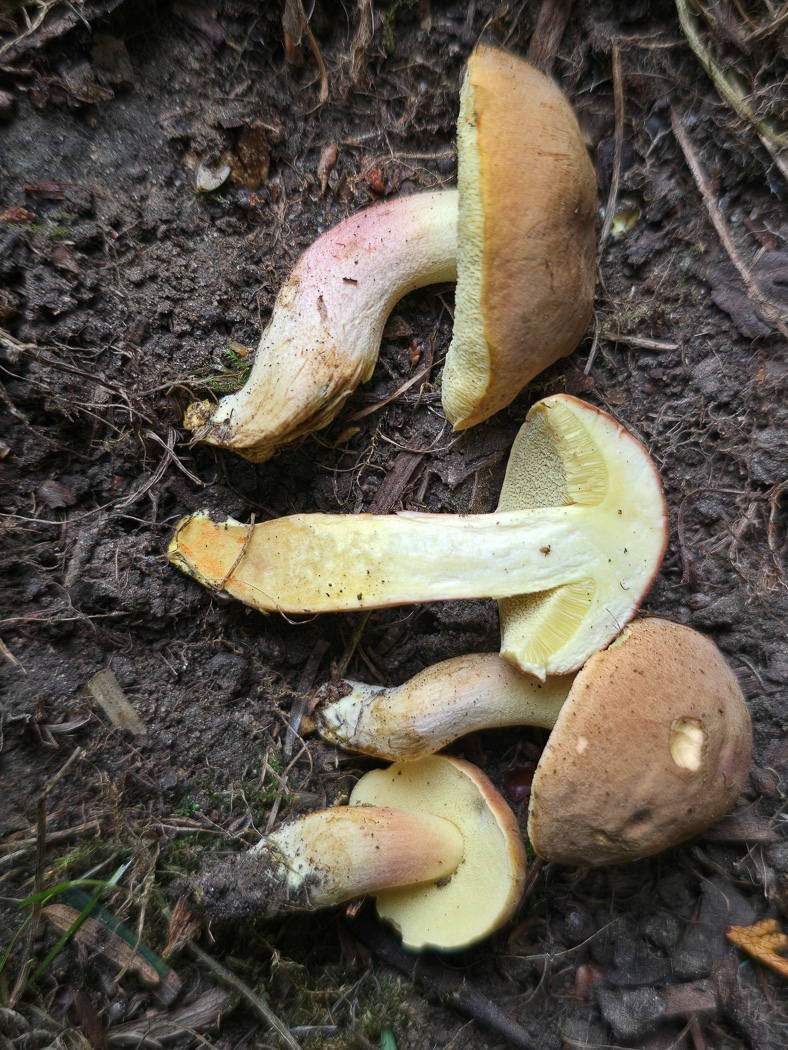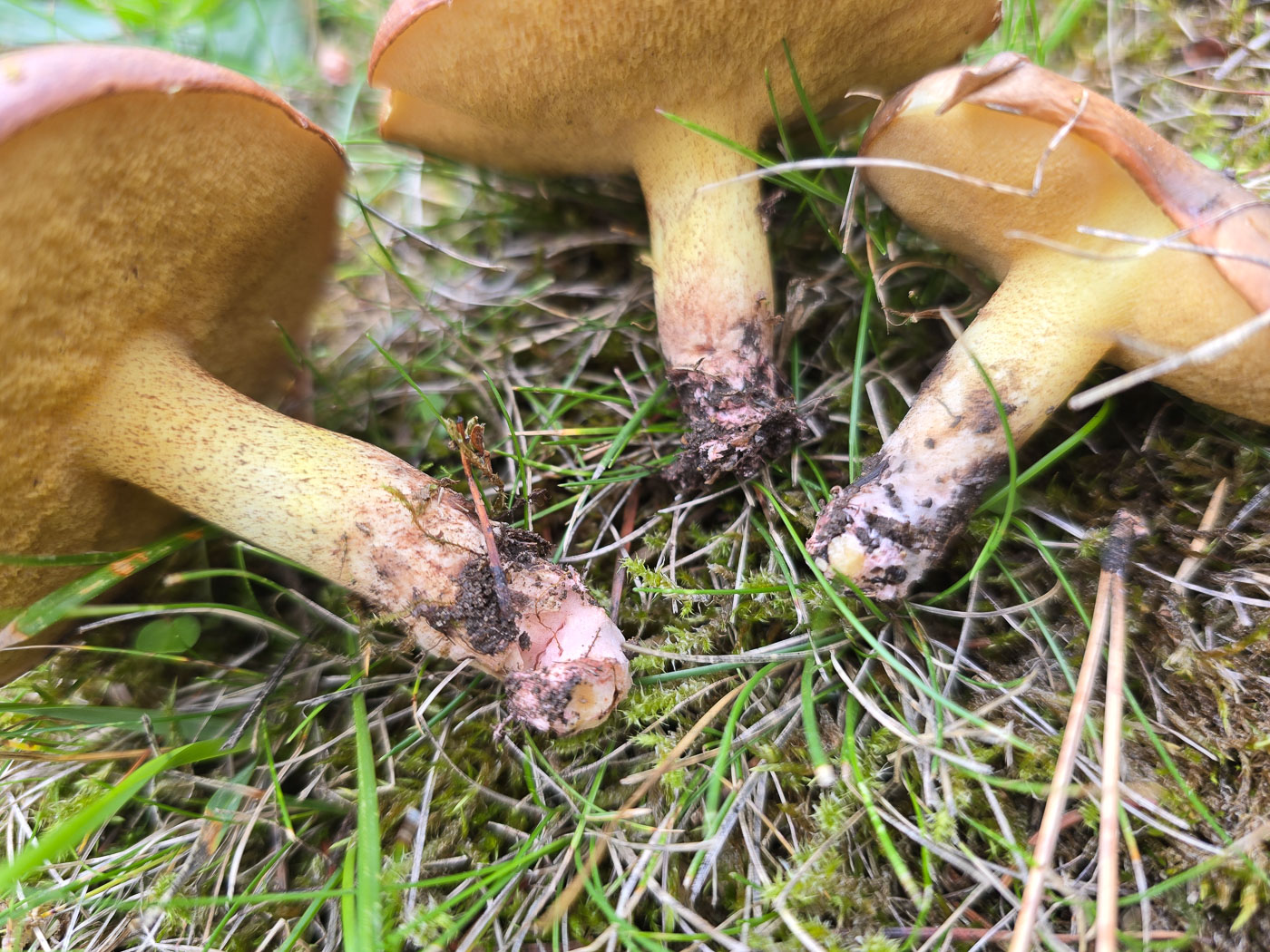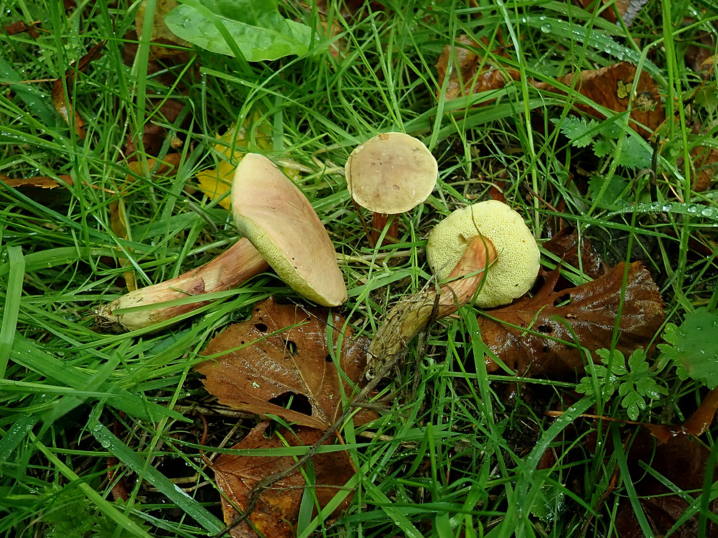 September 17th Hortiboletus bubalinus (Ascot Hat) At Turville Heath there were literally hundreds of Xerocomellus–type boletes with red-cracking caps which Penny ignored - they aren't her favourite! But she spotted these three under the Limes which caught her eye because they appeared very different: cap with no cracking but rather a velvety surface, also with a soft peachy pink tinge. These she collected and was glad that she had because when at home she cut one in half lengthways the blue tinge to the cap flesh though pink just under the cuticle was a perfect match to this species which she'd never found before. The yellowish flesh in the lower stem also matched, and this together with its apparent preference for Lime clinched it for her. There are only around 20 FRDBI entries, all since 2016 as the species was not recognised as British until then. Previous finds |
