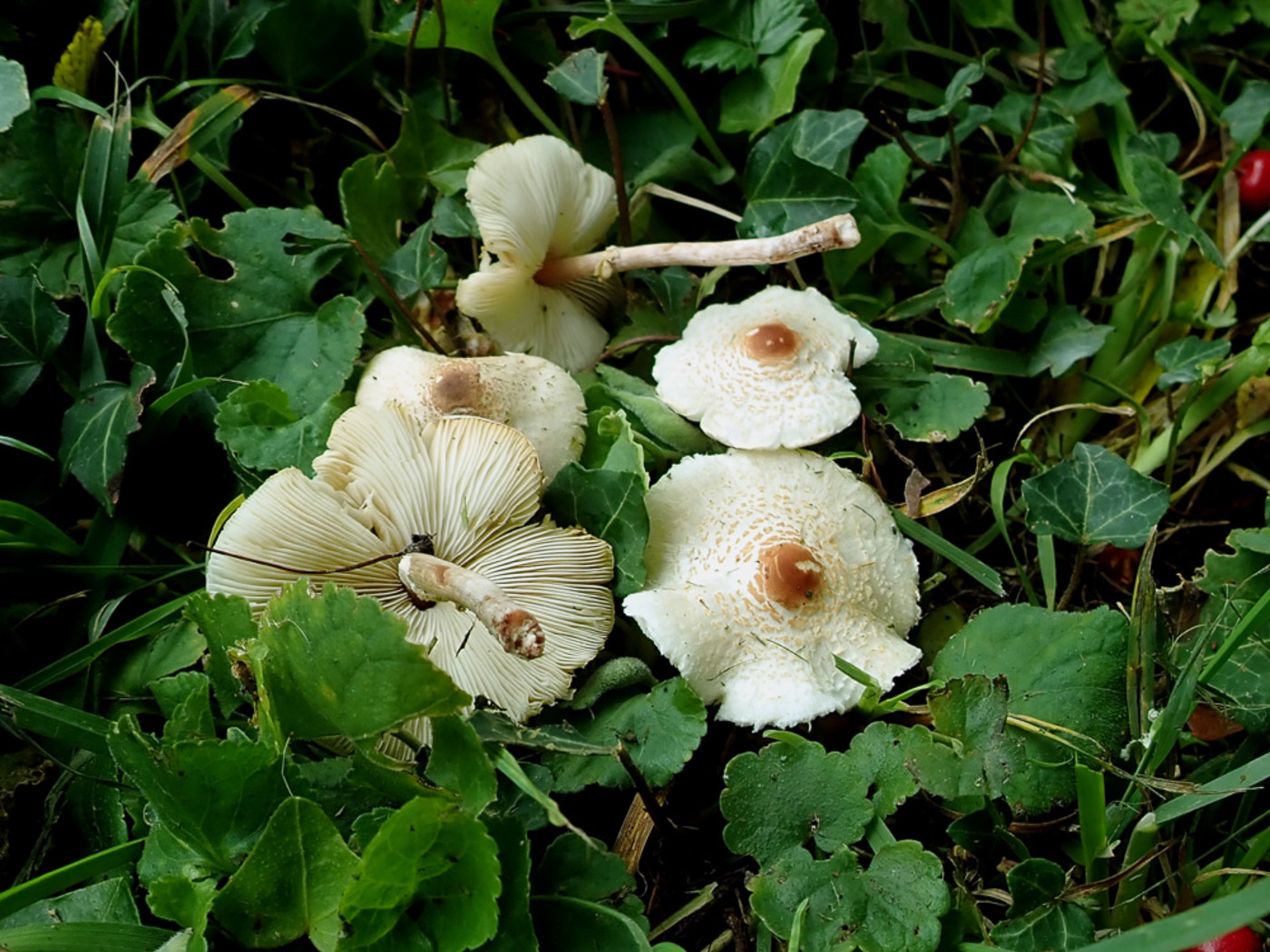 September 18th Lepiota cristata (Stinking Dapperling) In Bradenham churchyard Penny found just a few of this distinctive but common species. A small Lepiota, it has a whitish cap with a marked brown centre, this colour then spreading outwards on the concentric scales, becoming paler towards the margin. Like all of the genus, the gills are white, crowded and 'free', ie not attached to the stem, and it has a strong unpleasant smell. Other quite similar species can also have this same smell but to a lesser extent. Previous finds |