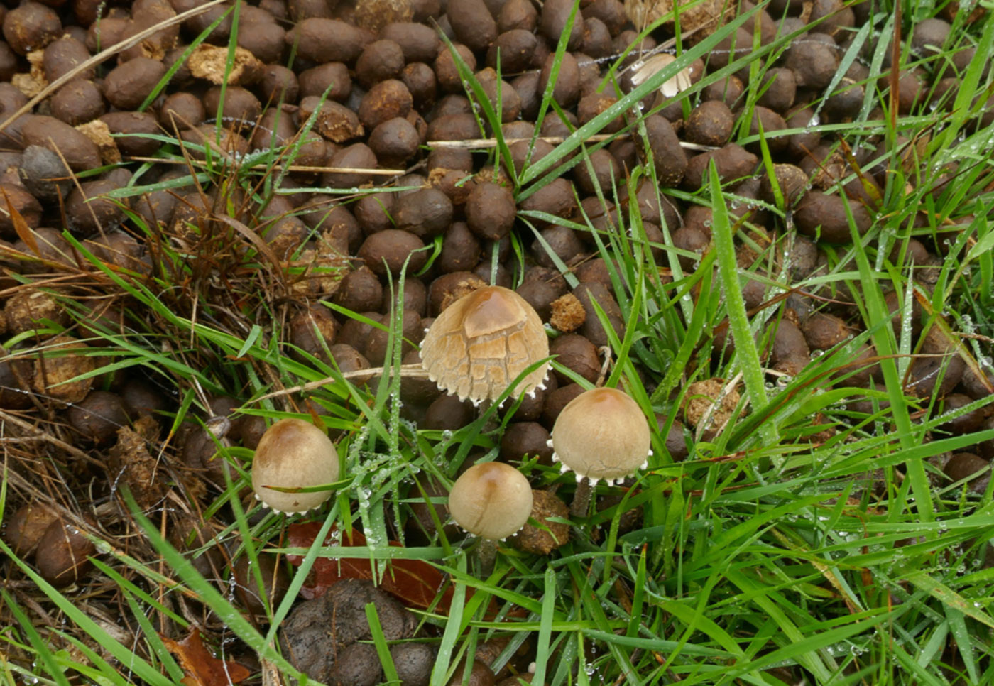 September 17th Panaeolus papilionaceus (Petticoat Mottlegill) At Stampwell Farm Jackie Ewan found a patch of these frilly caps in a grassy area frequented by goats, their dung very much in evidence here! Most members of this genus need a scope to identify to species but this particular dung associate is so distinctive with the veil remnants around the rim - there can surely be no mistaking it. Previous finds |