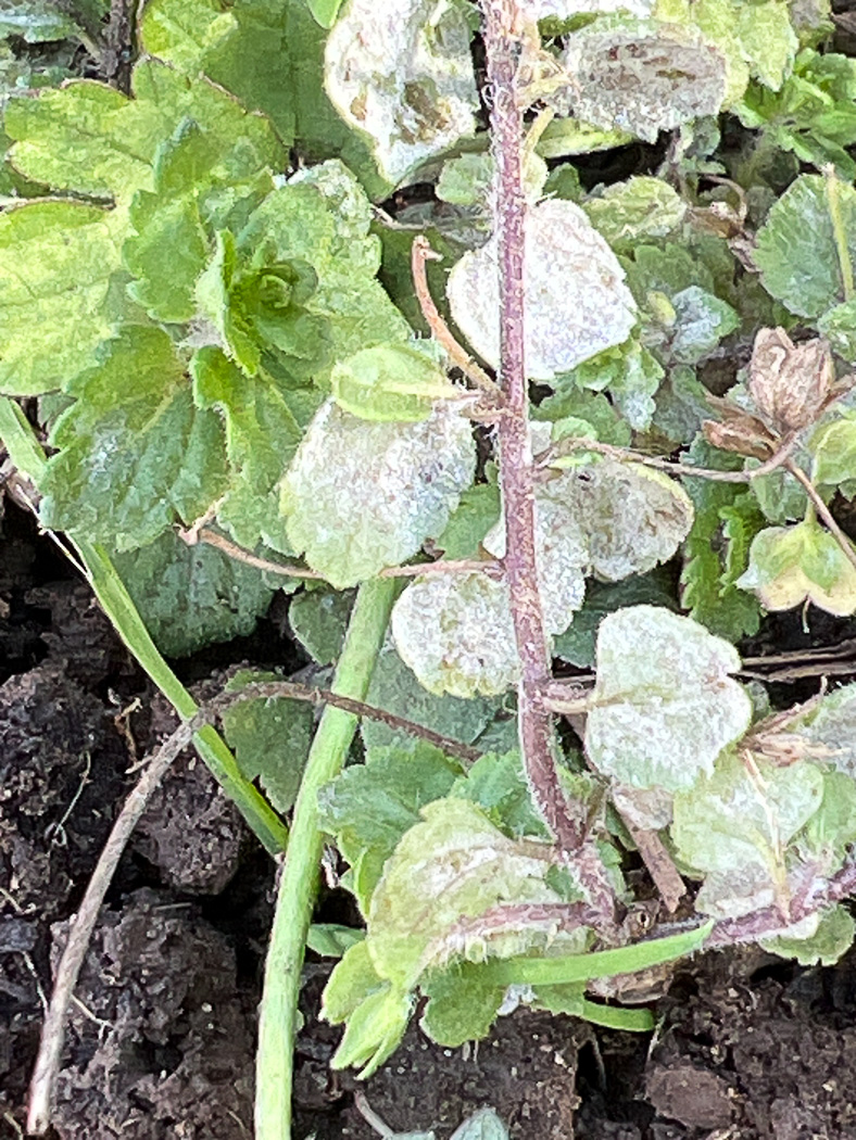 September 8th Podosphaera fuliginea (a species of mildew with no English name) On his allotment in Walters Ash Neil Fletcher noticed this powdery mildew affecting a very common weed there, Veronica persica (Common Speedwell). It apparently also occurs on the gourd family which is no doubt why it should occur in this habitat, but it appears to be our first county record - no doubt due to the lack of observations and necessary knowledge rather than its rarity. New find |