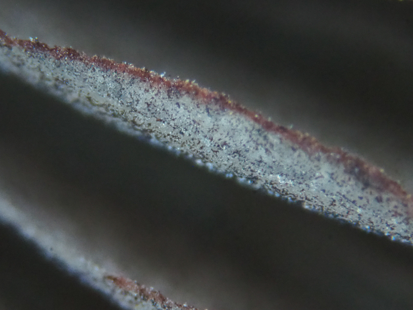 September 4th Psathyrella pseudogracilis (a Brittlestem with no English name)![]() In a grassy part of Naphill Common John and Lesley Catterson found this quite unusual species and John carefully checked the spores and other cells to identify it, also noting the clear red gill edge (photo 2) which is characteristic of this species together with a few others in the genus. It is not that rare but the genus as a whole tends to be overlooked and can be very tricky to name to species, but Penny is confident John has ticked all the boxes here. Previous finds |