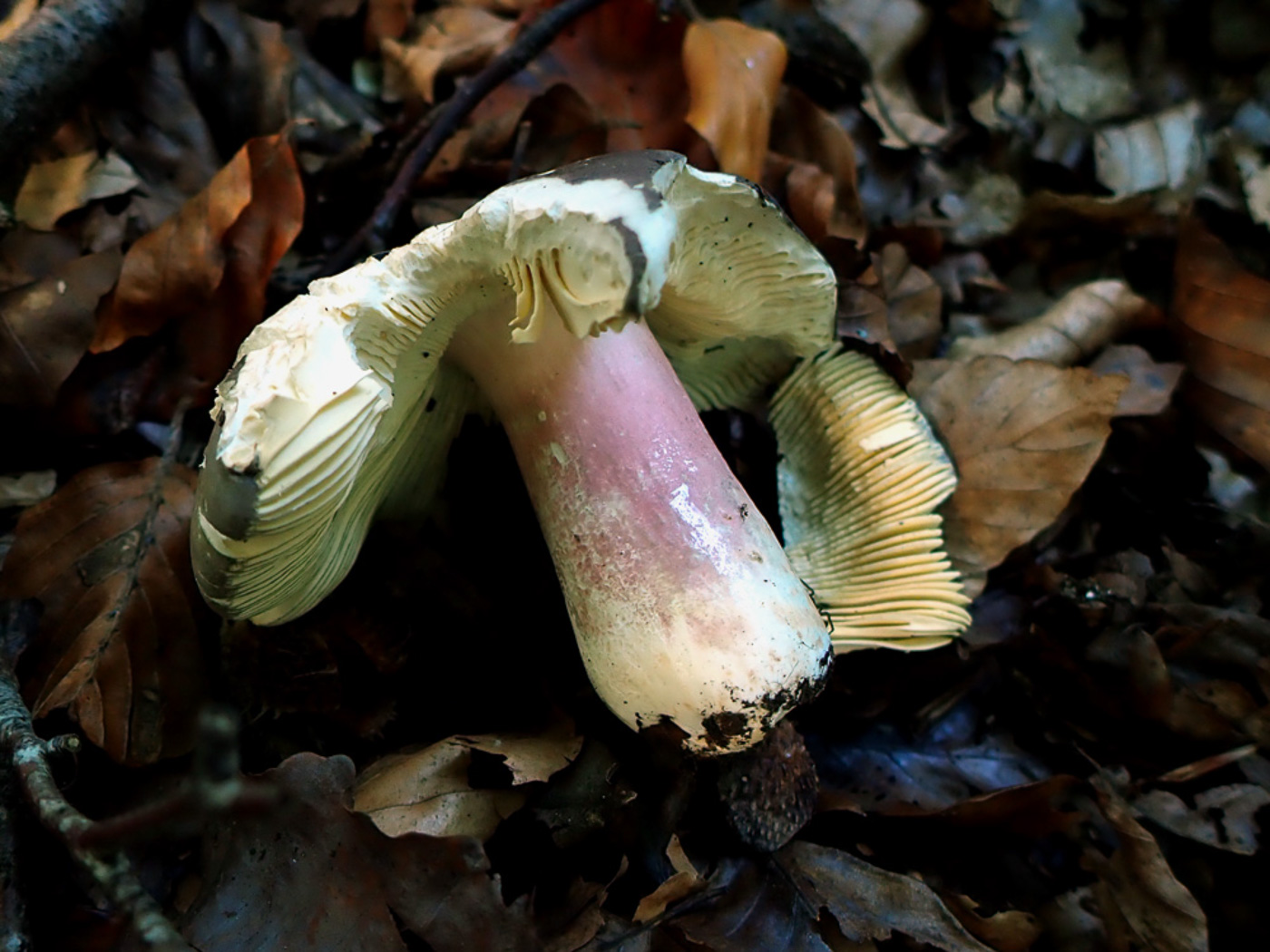 September 27th Russula olivacea (Olive Brittlegill) When Penny visited Gussetts Wood - a beautiful Chiltern beechwood - the floor was brimming with this large Brittlegill amongst many other things. Host specific to Beech, it is not uncommon in this area and is somewhat variable in cap colour, tending to have olive shades at first but soon becoming purplish pink, often with cream markings also. The gills are dark cream and the thick chunky stem, basically white, regularly develops a subtle and beautiful shade of pink which seems to glow and occurs just under the cap and sometimes lower down also (though this subtle colour seems reluctant to show really well in a photo). If in doubt over ID this feature together with the Beech association is the clincher. Her visit a week or so later produced further photo opportunities showing the olive shades of the young caps (photos 3 and 4). Previous finds |