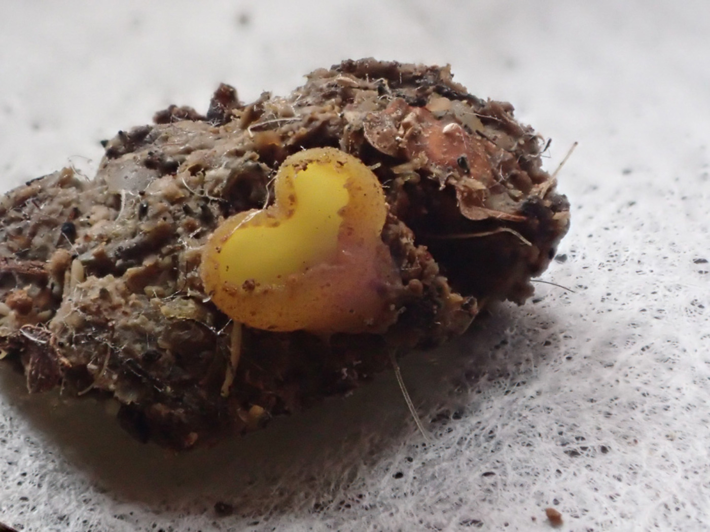 February 9th Elaphomyces muricatus (Marbled False Truffle) In Chalfont St. Peter Jesper Launder spotted various dig holes on a residential lawn, and with the owner's blessing he checked the holes for truffles. At the bottom of one, a squirrel-scraped surface of an Elaphomyces truffle was just visible, but only on excavating it did he realise why the squirrel had failed to remove it. It was an absolute whopper! This species is described as reaching 2.5cm across at most, but this one was a good cm larger than that! However, the distinctive garlic smell together with microscopic features left no doubt though it was, in his words: 'far and away the largest specimen I've encountered!'. Previous finds |