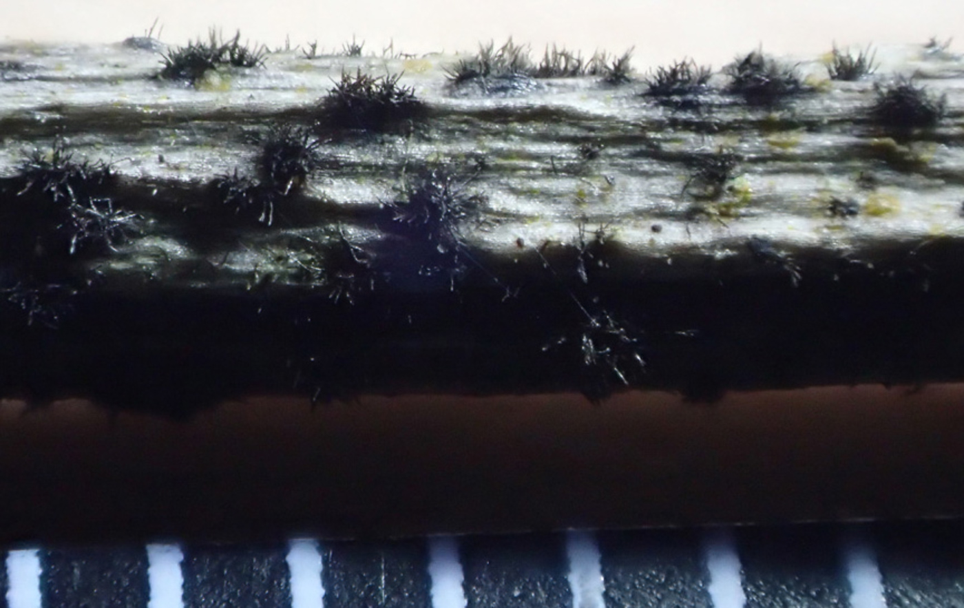 March 22nd Corynespora smithii (a hyphomycete asco with no English name) Whilst examining dead Holly twigs on the edge of Naphill Common Sarah Ebdon chanced upon these tiny hairy specks and though having no idea what they might be she decided to have a go at identifying them. She came up with this species of plant pathogen and, though there are virtually no macrophotos available, the micro characters appeared to be a perfect match in several sources including Ellis & Ellis. It can occur on a range of dead woods and is probably very common but massively under-recorded (as are many other similar species, no doubt). It's no surprise that this is new to the county and Sarah's macro-photos seen here appear to be the only available source. The 1mm scale shows just how tiny this species is. Members' Finds New Species no. 1270 |