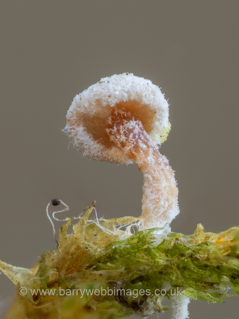 March 4th Mycena dasypus (a rare Bonnet with no English name) At the edge of the mire in Burnham Beeches Sarah Ebdon spotted this tiny Bonnet growing in Sphagnum and, knowing the story behind the discovery of Mycena dasypus here several years ago, she took it home to see if she could find the remarkable cystidia on the gill edge which would confirm its identity. Sure enough they were easily found and she agreed with Penny's previous comments that they are so unique in length as to make them unmistakeable with those of any other known species of Bonnet. This is a notable find, being the first time this rare species has been found fruiting at this time of year. Previous finds |