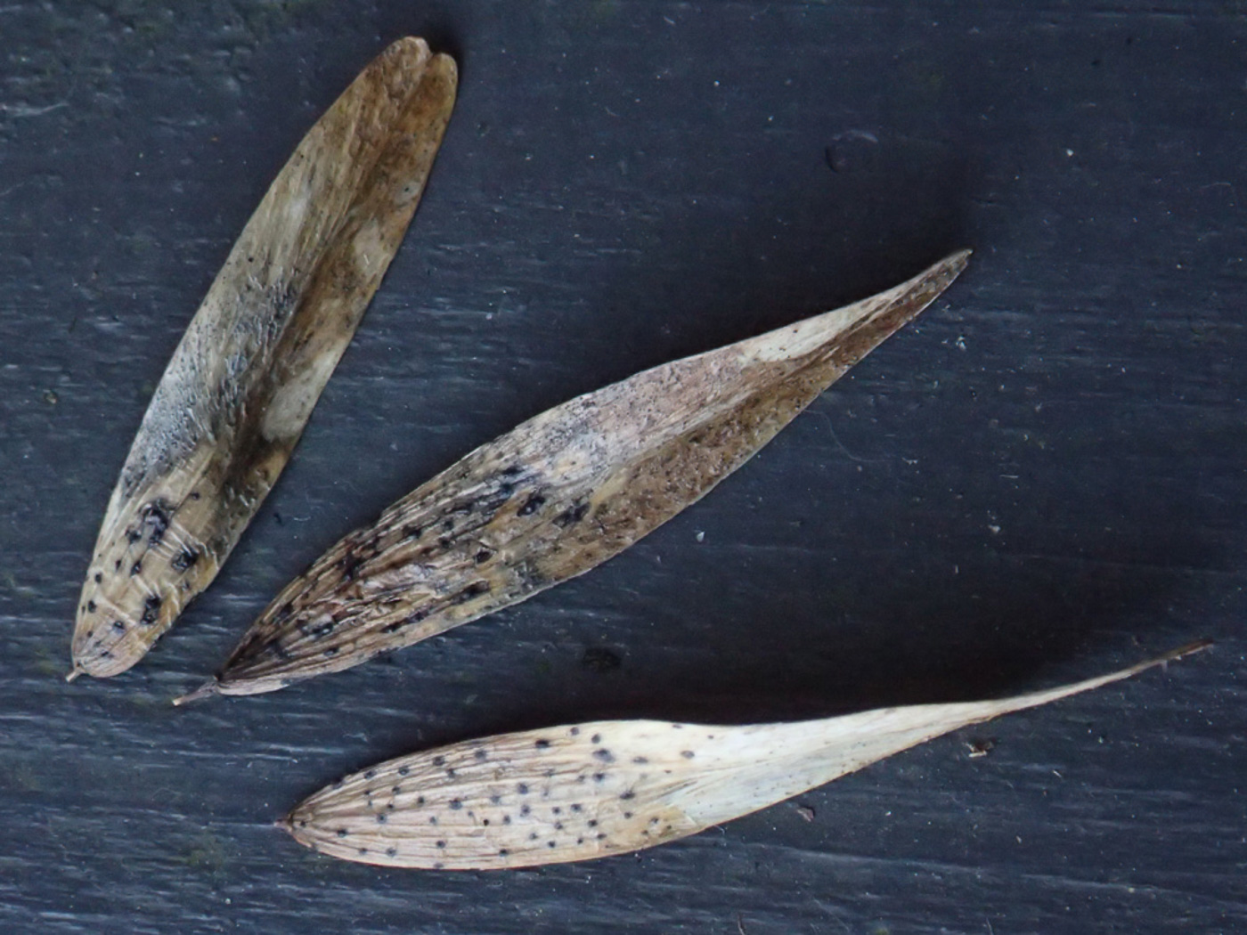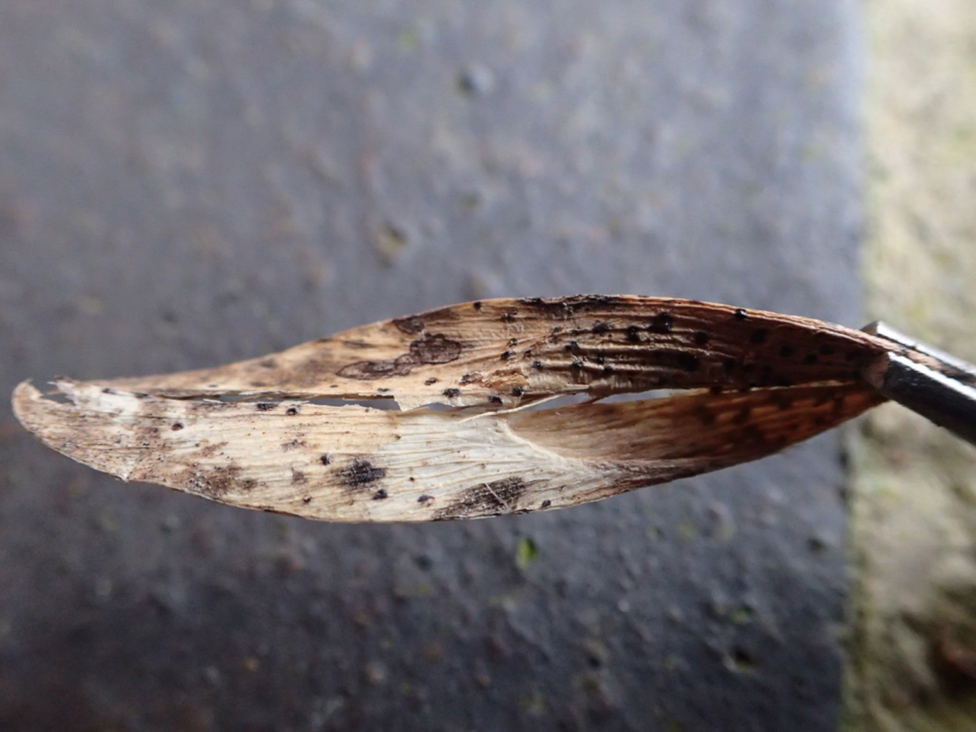 March 11th Diaporthe samaricola (an asco with no English name) At Northmoor Hill Reserve near Denham Jesper Launder picked up this fallen last year's Ash key and noticed the distinct black dots at the seed end. Sarah Ebdon then took them home to check, identifying them as D. samaricola, but at the same time noted the much small black dots of Neosetophoma samarorum at the wing tip of the same key. (See the separate entry for that species.) Though very common, these two species were new to the county when discovered by Neil Fletcher in 2021. Photo 2 was of a find made by Sarah at Prestwood churchyard 2 weeks later and demonstrates how the larger D. samaricola colononises the seed end of the key whereas the much smaller N. samarorum colonises the wing end. Previous finds |