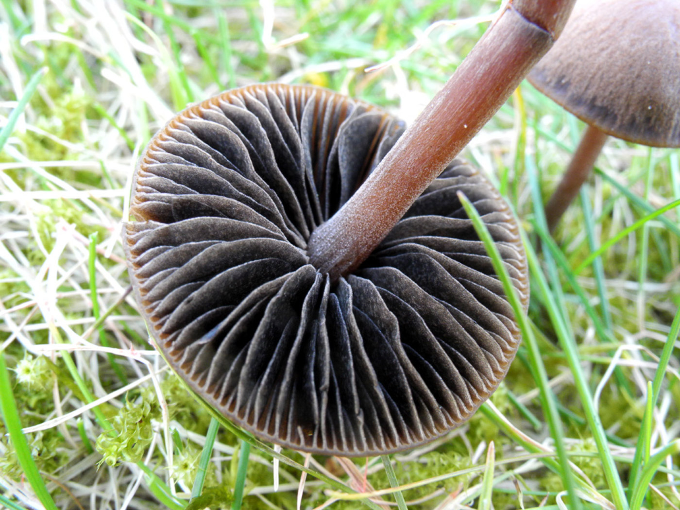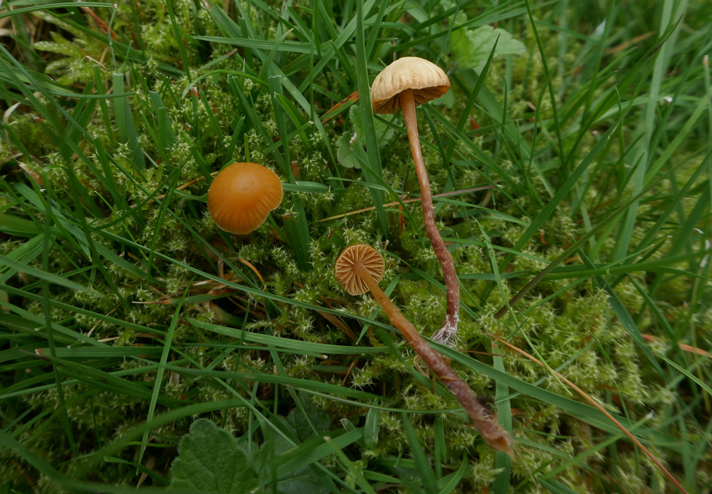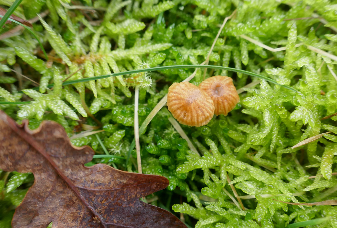 February 14th Galerina variibasidia (a rare Bell with no English name) At Stampwell Farm in the Cherry avenue Jackie Ewan found this small Bell species growing as before in the moss Rhytidiadelphus squarrosus (Springy Turf Moss). This is a fungus newly described in 2021 with as yet extremely few UK collections, and as our first attempt to get a sample from Jackie sequenced unfortunately failed, we hope for better results from a subsequent collection she made last autumn in order to confirm it. In fact she comments that she's noticed this species here every month from February to May and again from September to December. (In her photos 1 and 2 the predominant moss visible is in fact Pseudoscleropodium purum (Neat Feather Moss) but she noted that the Rhytiadelphus was also present. However in photo 3 - taken in 2024 when she first became aware of this Galerina - the predominant moss is the Rhytiadelphus.) Previous finds |