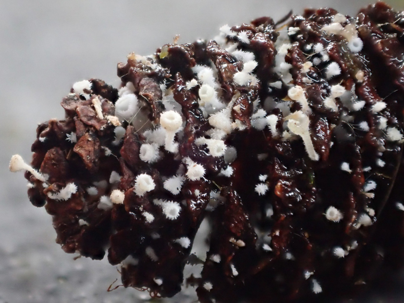 February 25th Lachnum virgineum (Snowy Disco) In an area at Beaconsfield Services with Alder, Sarah Ebdon and Jesper Launder went searching for some special fungi which associate specifically with that host on the fallen catkins. To their surprise they came across this tiny white hairy asco colonising one of the cone-like female Alder catkins. Suspecting it might be something unusual given this host, Sarah checked it out with a scope but found that it fitted exactly with Lachnum virgineum - very common on fallen deciduous bare wood, but on this host?! Photo 1 is Barry Webb's. Then a few weeks later when at Northmoor Hill Reserve she found even better examples of this same species literally festooning the female cones of Alder. Photos 2 and 3 are Sarah's from this second site. Previous finds |