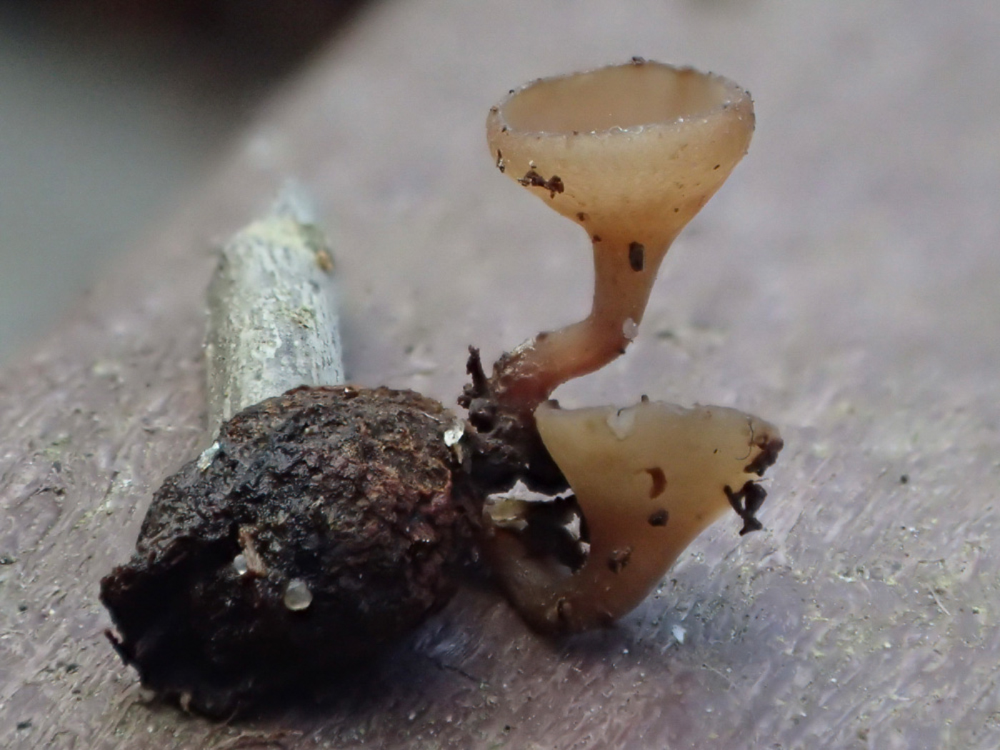 February 25th Ciboria amentacea (Alder Goblet) In an area at Beaconsfield Services with Alder, Sarah Ebdon and Jesper Launder went searching for a particular springtime asco which associates specifically with the previous year's decomposing male Alder catkins. To their delight they were rewarded with not just one or two examples but many tens of them. They report that at one point, disturbing some thick vegetation to look underneath it, they noticed a puff of spore dispersal - amazing when one considers that these tiny long-stemmed cups are no more than 6mm across at most. This not surprisingly is a new species for the county as we don't seem to have many areas where Alder occurs, though FRDBI is not short of records. What a lovely find! The photos are Sarah's. New find |