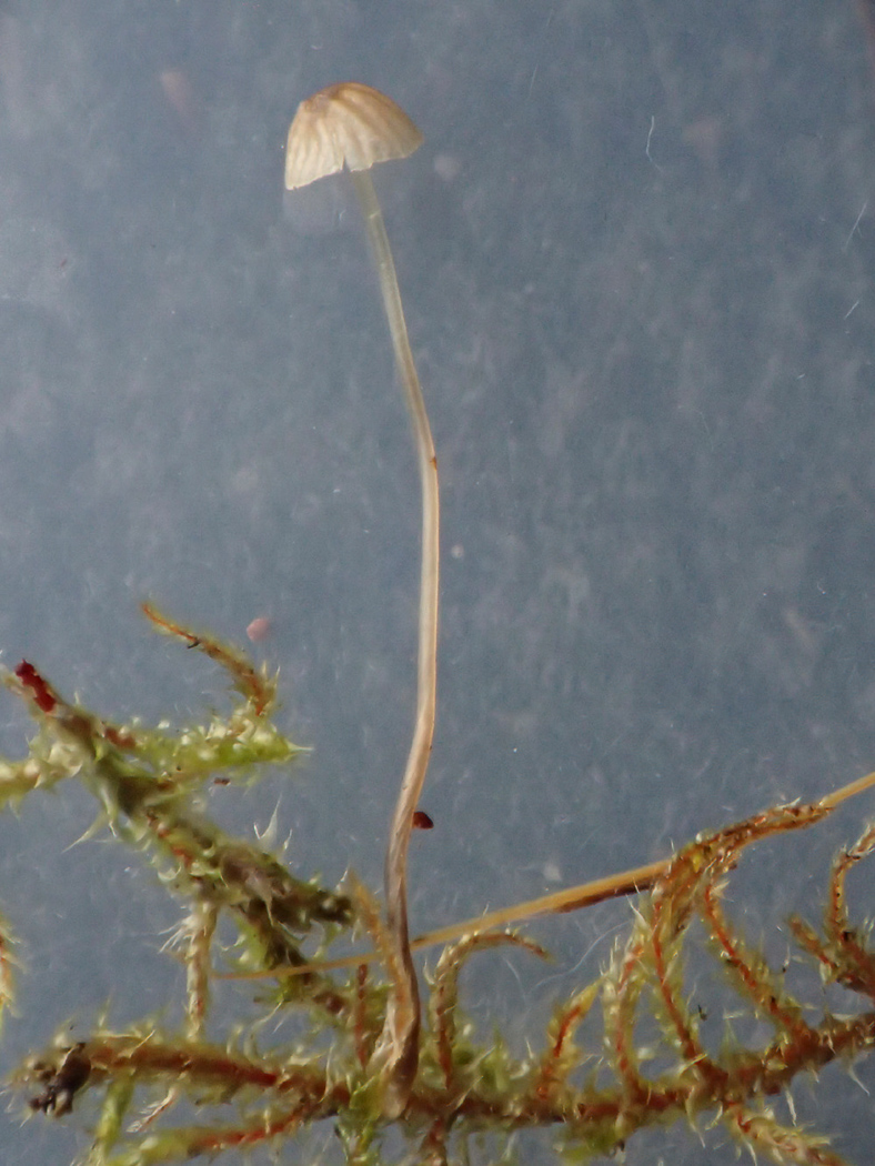 March 11th Deconica phillipsii (an unusual Oysterling with no English name) At Northmoor Hill Reserve Jesper Launder, searching amongst wet vegetation for small fungi of any sort, noticed this tiny fluffy pinkish mushroom on Kindberbia praelonga (Common Feather Moss), the cap no more than 1mm across. After a fair amount of research he eventually tied it down to Deconica phillipsii, previously in genus Melanotus and also at some stage in Psilocybe. Its closest relative is probably D. horizontalis though that species is found on wood and is not unlike the genus Crepidotus in appearance, ie having an eccentric stem. However, this specimen was still so tiny that the stem still appears almost central but microscopic features together with its pale colour and occurrence in wet vegetation were a perfect match. We have a smattering of previous county records, all on vegetation stems in wet sites such as Rushbeds Wood and Burnham Beeches. The photo is Barry Webb's. New find |