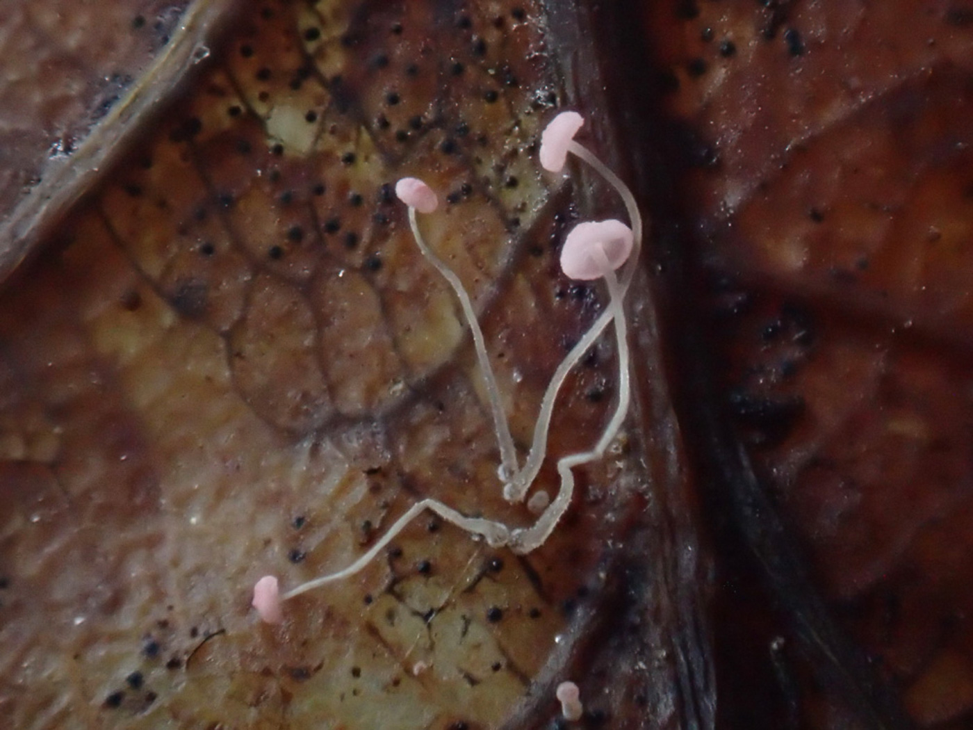 March 4th Mycena smithiana (a rare asco with no English name) In Burnham Beeches Jesper Launder spotted these simply tiny Bonnets on a fallen Oak leaf and Sarah Ebdon instantly recognised them by their distinctive pink tint together with occurring on this particular substrate. Though not rare this easily overlooked species has around 100 FRDBI entries with the vast majority from October to December but extremely few from the spring months, so this was a notable find (and in fact not the only Mycena found today either!) The photos are Sarah's with photo 2 including her fingernail to give an idea of their miniscule size. Previous finds |