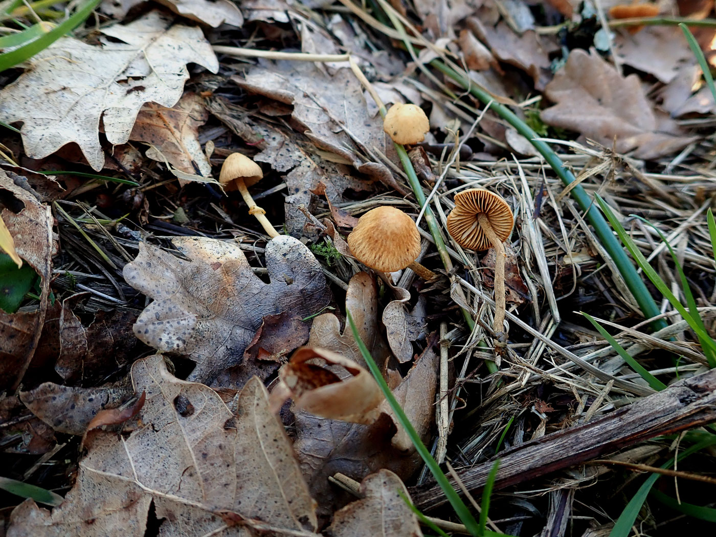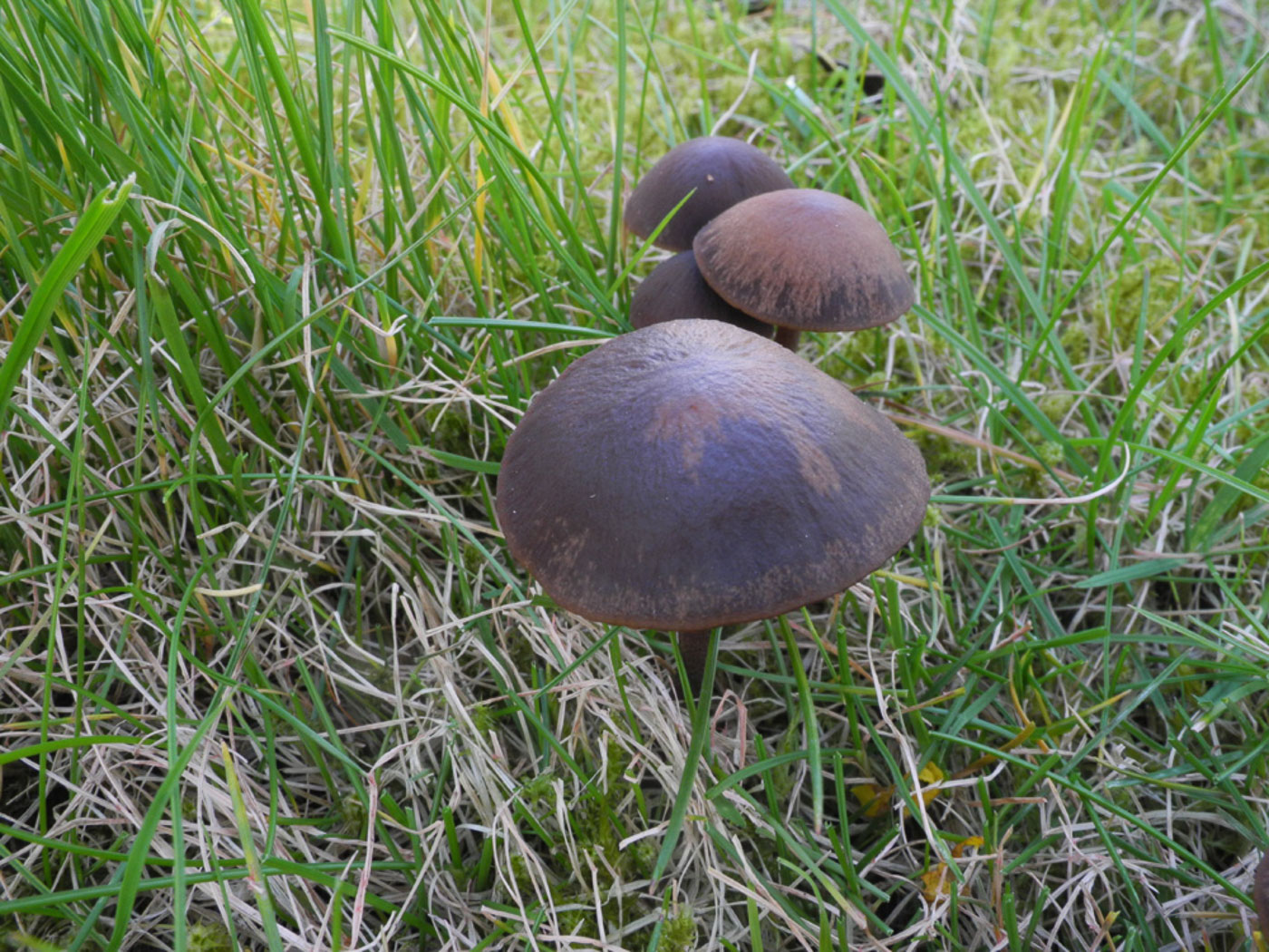 February 6th Galerina graminea (Turf Bell) In Gerrards Cross in a grassy verge Jesper Launder spotted this little group and recognised not only the genus but also the species, this being quite a common species of Bell with which he is familiar though he's not come across it for quite some time. It is a new entry for Finds though this in itself is not an indication of rarity but more likely evidence that few of us spend time studying this tricky genus - one which is not that hard to name to genus but having many species which appear almost identical and microscopic characters which are not always easy to interpret. New find |