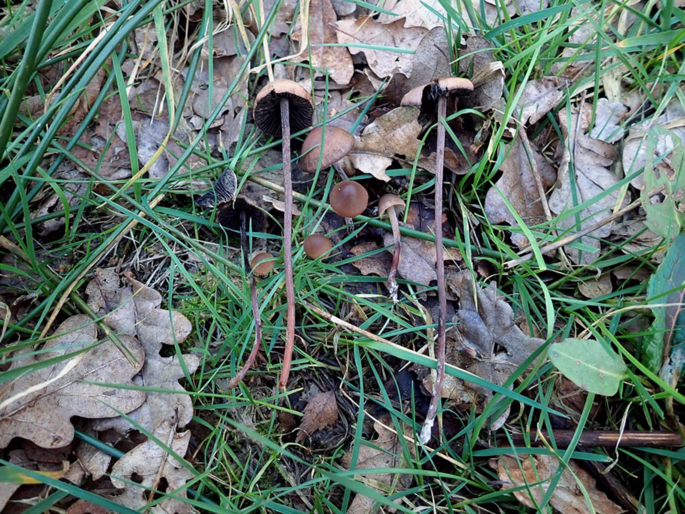 March 17th Panaeolus acuminatus (Dewdrop Mottlegill) At Turville Heath in a damp grassy area with Juncus Penny came across a selection of Mottlegills, placed them together to show the variety in size, particularly stem length which can be surprisingly long depending on the surrounding vegetation, then later checked the spores to confirm their ID. This is a common grassland LBJ though not associating with dung as do some others in this genus. A further feature which can help with ID is the presence of tiny droplets on the upper stem though today's (welcome) sun had all but dried them up. On returning home Penny found more photos of this same species (photos 2 and 3) just sent in by Tony Knight from his lawn at Long Crendon. Previous finds |
