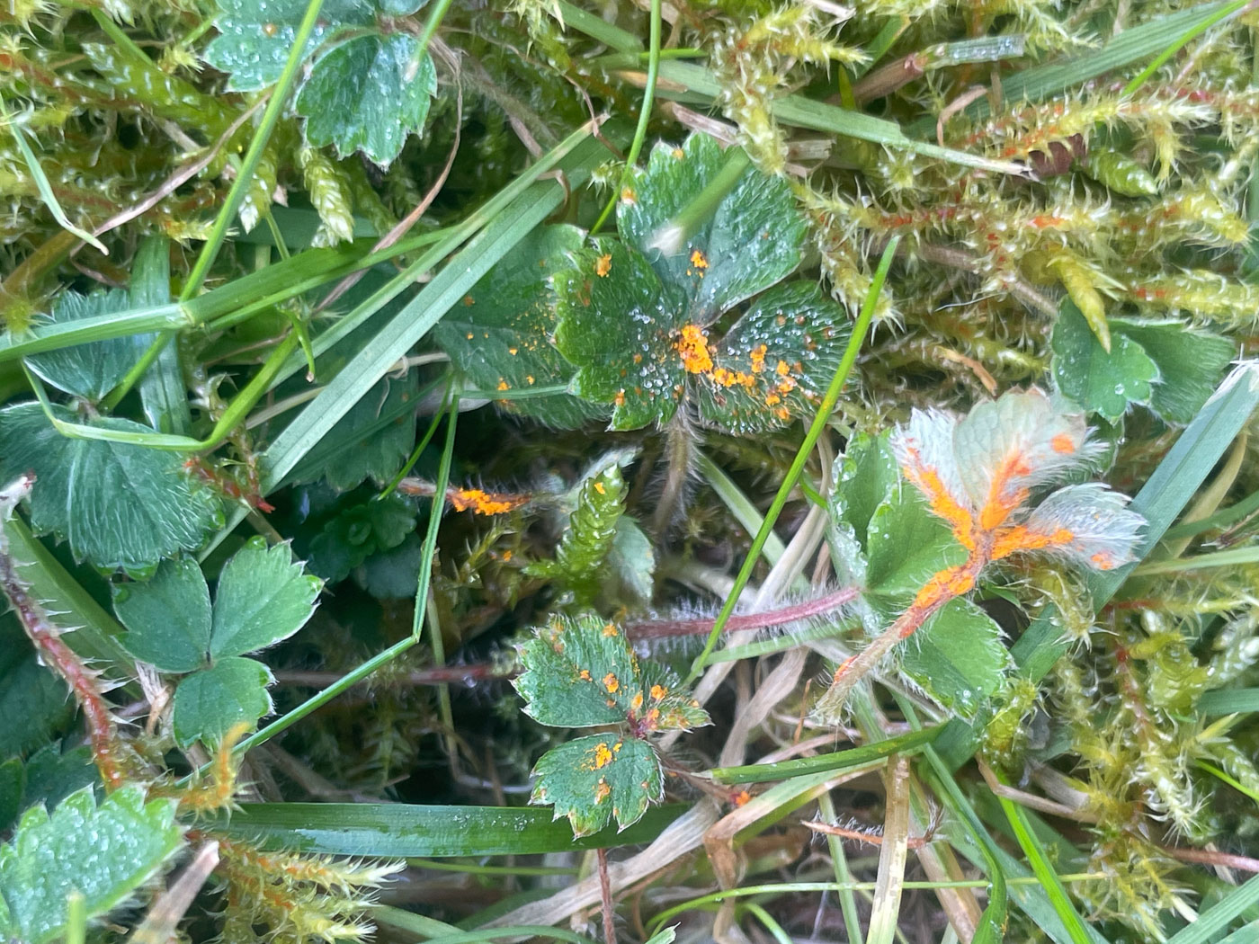March 21st Phragmidium fragariae (a species of Rust with no English name) In Prestwood churchyard Sarah Ebdon recognised this rust on the leaves and stems of Barren Strawberry - a plant almost identical in appearance to Wild Strawberry but having the terminal (central) leaf tooth shorter than the two adjacent teeth either side. Furthermore this rust, despite its Latin epithet, only occurs on Barren Strawberry which, as its name suggests, does not produce tasty fruits! We have only a few county sites where it has been recorded but it is no doubt very common. Previous finds |