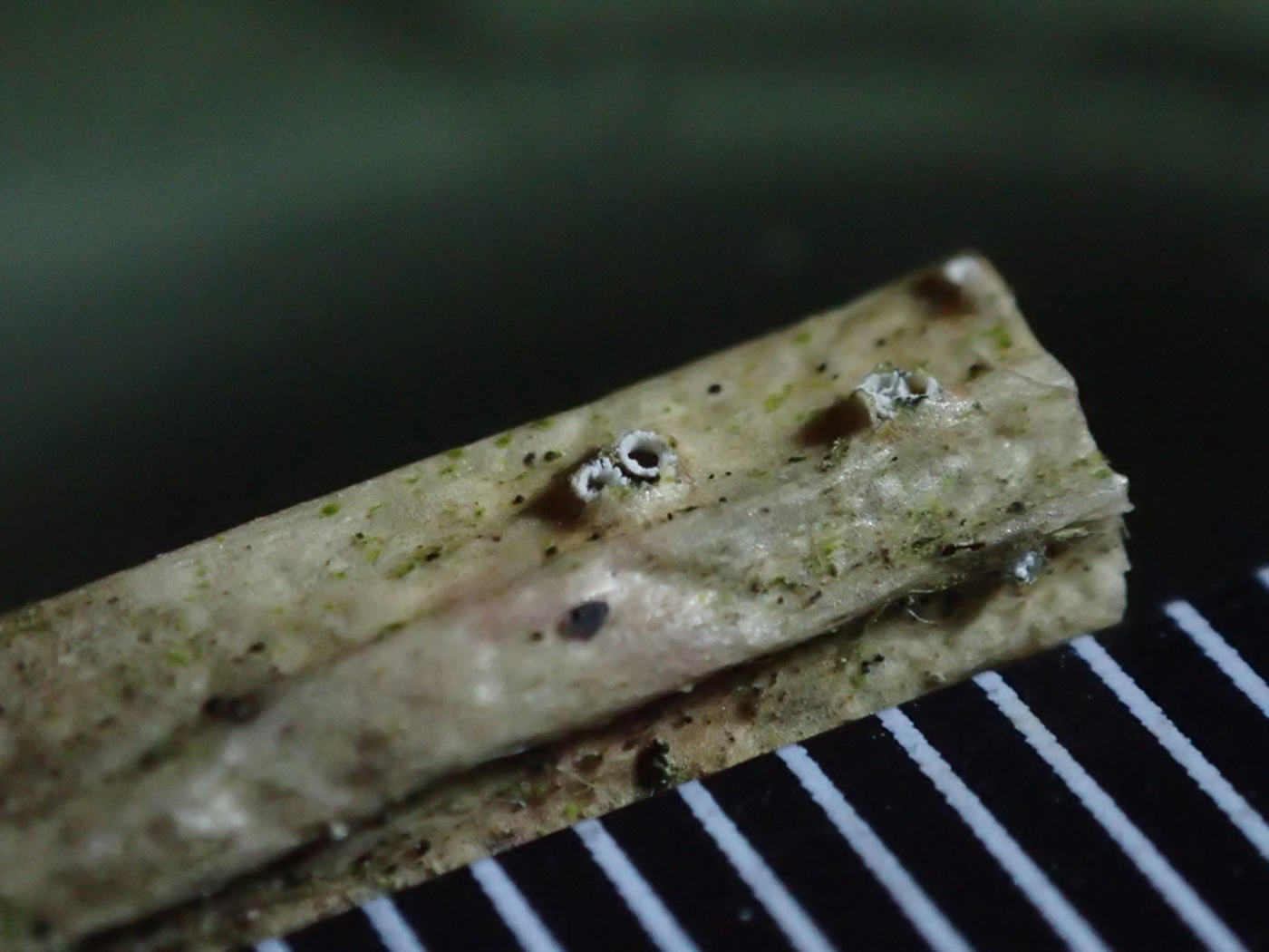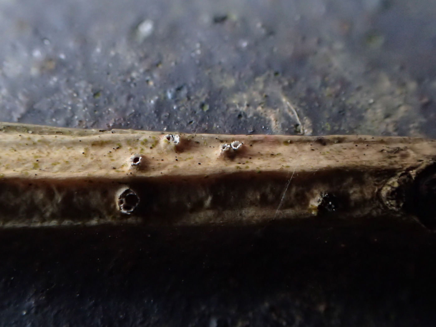 March 22nd Stictis radiata (an unusual asco with no English name) In a hedge on the edge of Naphill Common Sarah Ebdon noticed these tiny white dots on an attached dead Holly twig, looked closer with a handlens and decided to investigate further as they appeared quite distinctive being semi-immersed and having a white almost toothed margin. Some careful research into saprotrophic decomposers on Holly revealed this species which has incredibly long thin septate spores like spears - one end pointed and the other rounded. It can occur on dead wood and twigs of many different deciduous trees and garden shrubs. Like many such tiny species, it is probably very common but goes unnoticed and is new to the county. (Sarah's photos include one with 1mm scale and one cross-section.) Members' Finds New Species no. 1269 |
