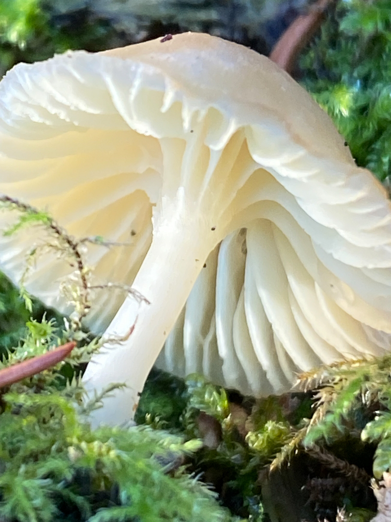 Oct 27, 2021. This was one of Penny's target species when she visited Stoke Common, but a search in the area where it had previously been found proved fruitless. However, later on in an open mossy patch she struck lucky! This is an uncommon species of acid heathland, Stoke Common being our only county site with just three previous records in the last 25 years. Similar to a small Clitocybe (Funnel) it has decurrent cream gills but they fork several times before reaching the margin (see photo 2), the distinctly grey cap develops a sunken darker centre but with a slight bump in the middle. Why not in Clitocybe? It has amyloid and not hyaline spores (ie they turn blue in Iodine). |