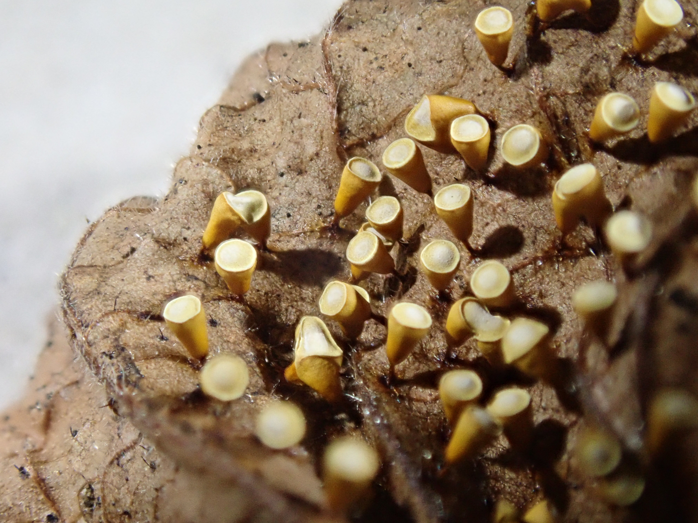 Jul 9, 2021. On fallen rotting Pine in Burnham Beeches Barry Webb found this tiny but beautiful species, one which is new to the site and was new to the county when Barry found it last September in Penn Wood (see in Finds 2020 dated Sept 20th). Photo 1 clearly shows the large cup at the base from which the meshlike network spreads - typical of this species, though in photo 2, of mature fruiting heads and taken a day later, the cup is reduced and the network more pronounced. |