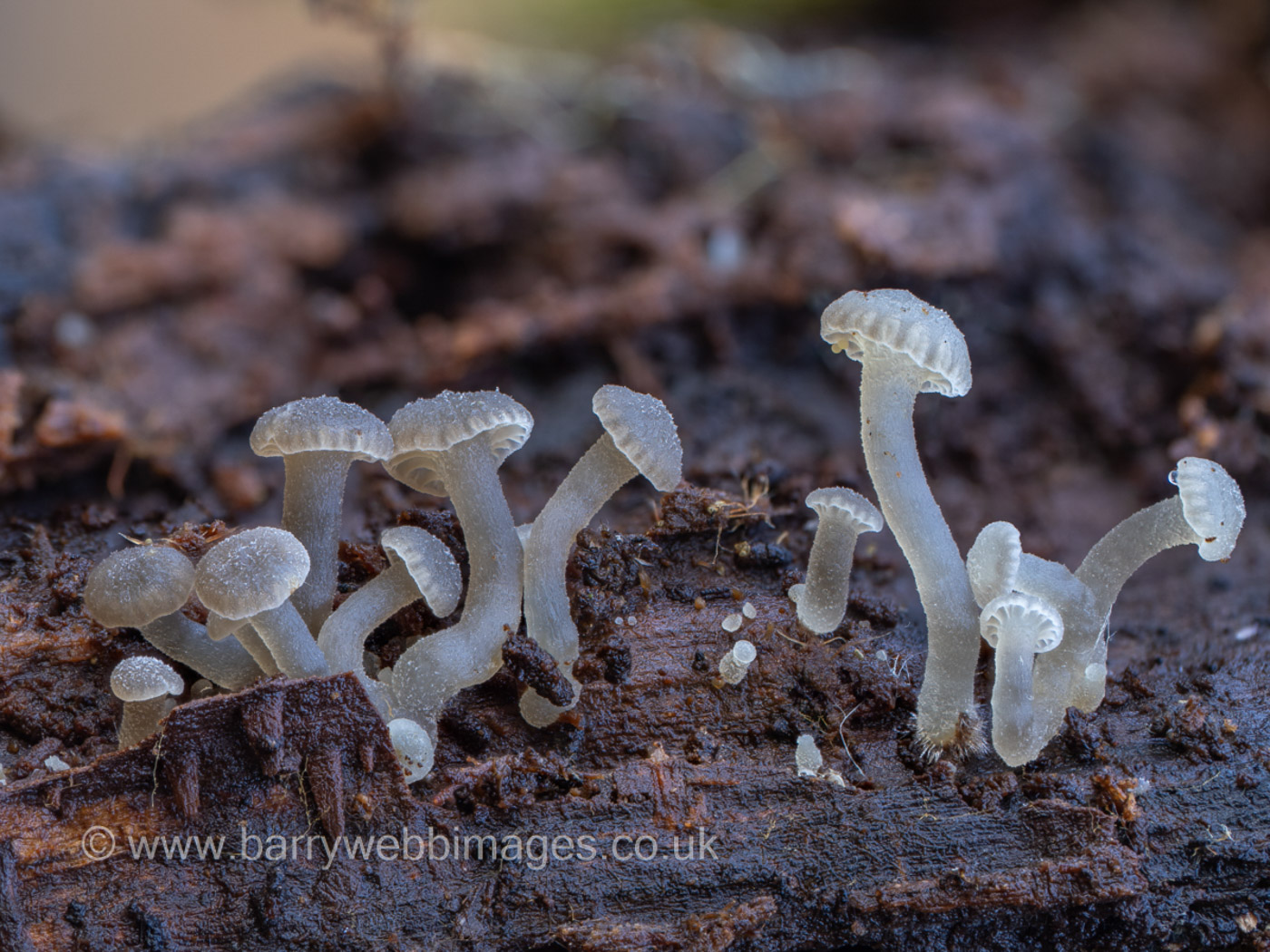 Nov 8, 2022. On a log pile of fallen Pear in his garden in Burnham Russell Ness found several specimens of this minute white Mycenoid species which favours damp deciduous logs. The first indication that you have this species rather than any other (there are many such to be found on wood) are the moisture droplets which tend to get trapped by the cells on the surface of the mushroom, some of which form unique miniscule corkscrews which Russell managed to locate with a scope. The species is not rare but easily overlooked or mistaken for some other white Mycenoid. |