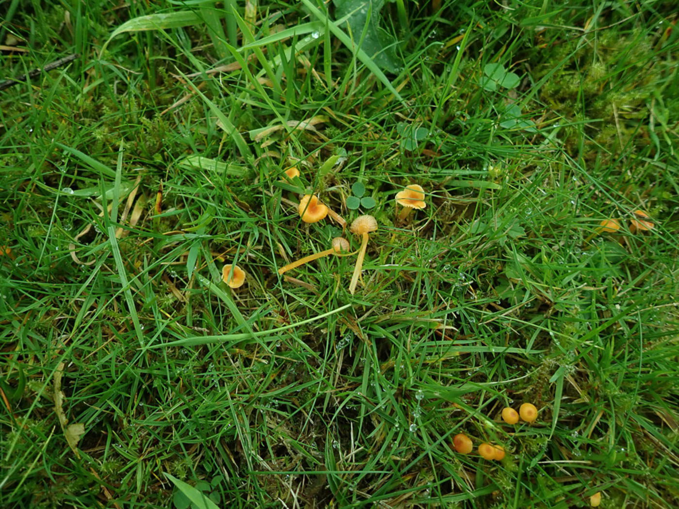 Sep 18, 2025. In Prestwood churchyard Penny found very little of interest but these bright orange Mycena-like fungi in the mossy lawn caught her eye and seemed worthy of mention. Their colour can fade to almost white when in bright sunlight when they appear even more Mycena-like but the strongly decurrent gills and occurrence in moss should alert one to their identity. They are much more common than the closely related R. swartzii which is similar in shape and size, also occurs in moss but is very different in colour. |