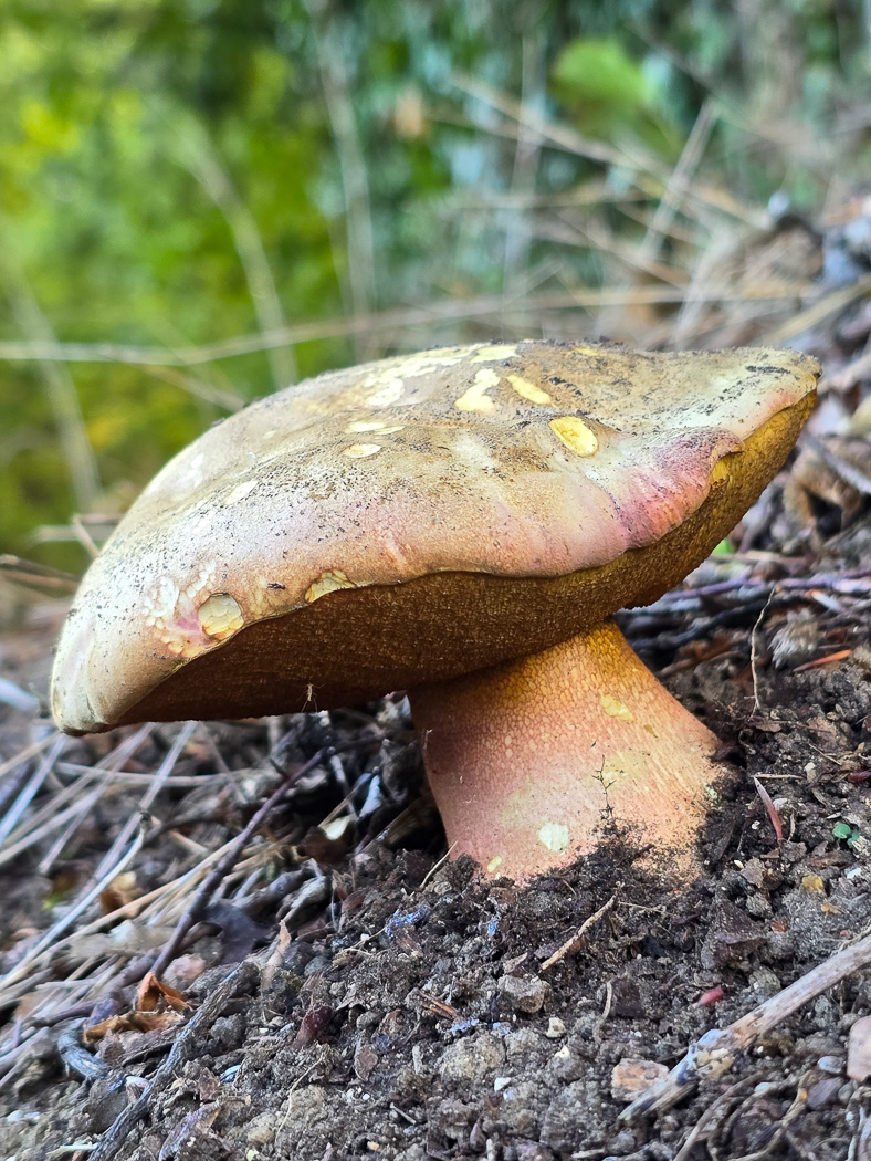 Oct 10, 2023. On a bank under Beech near Pullingshill Wood Noel Murray found these beauties - a rare Bolete for which we have only one previous county record in 2009. (What an unfortunate common name!). Somewhat similar to and easily mistaken for R. satanas (Satan's Bolete), today's species develops a pinkish tinge to the cap, has a longer much less pronounced clavate stem and a pleasant smell - all characters in contrast to R. satanas. Realising this was not that species but unable to identify it satisfactorily, his lovely photo went first to Penny, then on to Geoffrey Kibby who made the identification. This is obviously a first for Finds. |