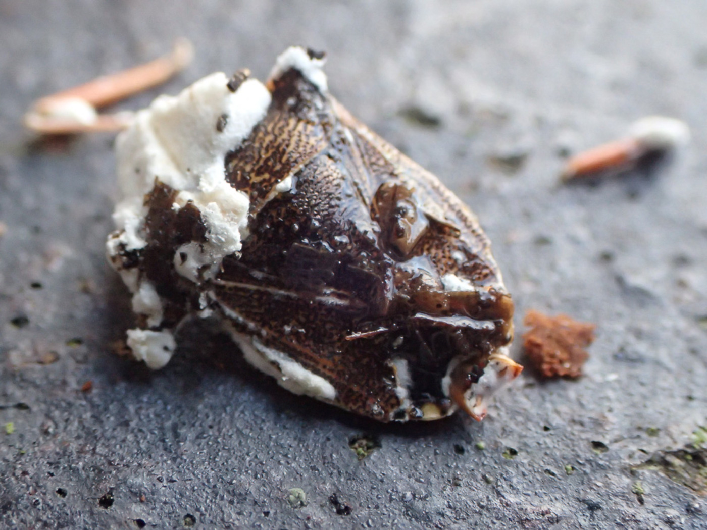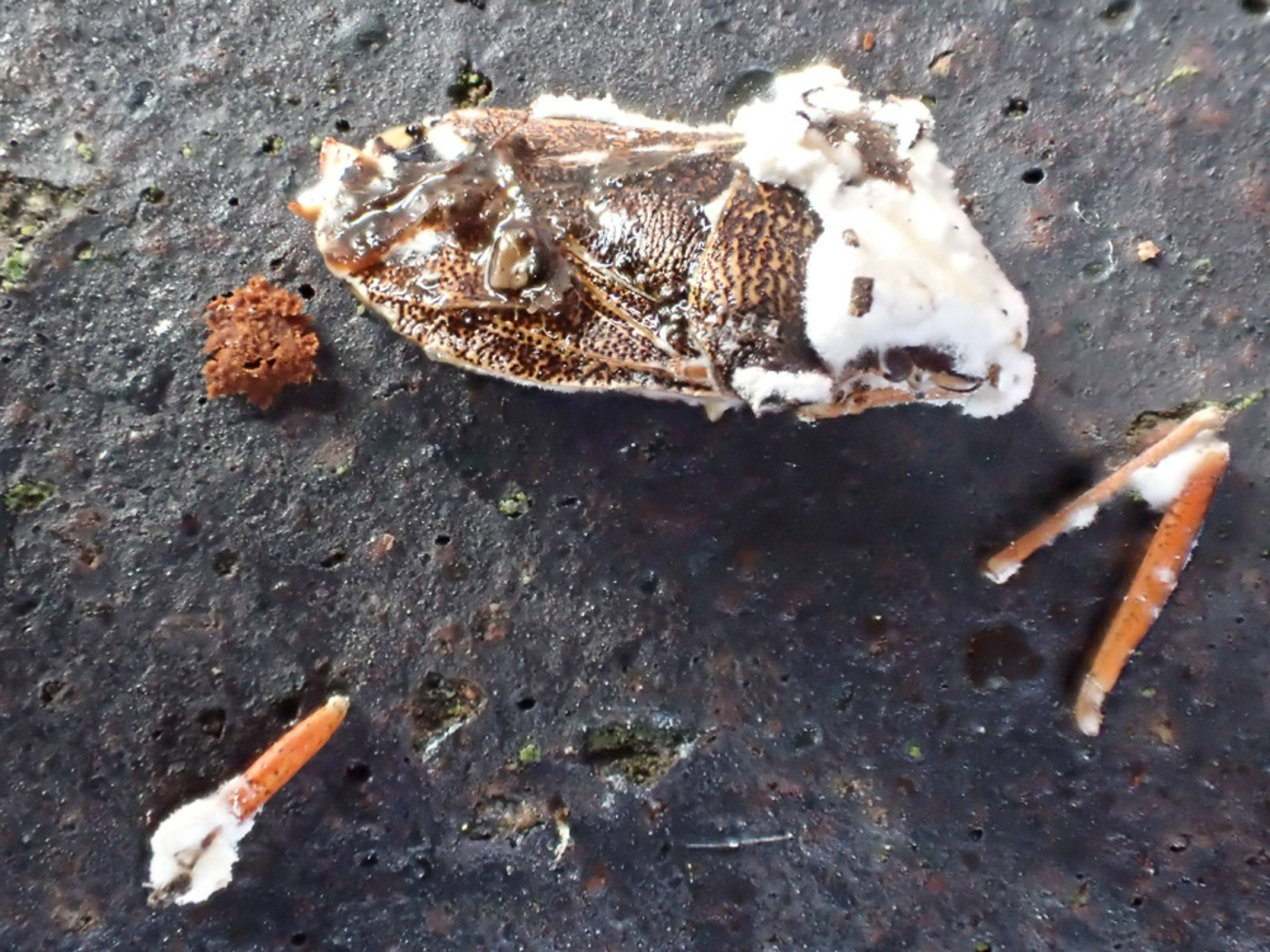 October 25th Beauveria bassiana (an asco with no English name) In Gt Bois Wood Arboretum near Chesham Sarah Ebdon spotted this small shield bug rather brutally infected with a fungus which she recognised, having found it several times before though we appear to have no entries in the BFG database. There are around 60 entries in FRDBI so it is not that often found though for obvious reasons could obviously go unspotted. New find |