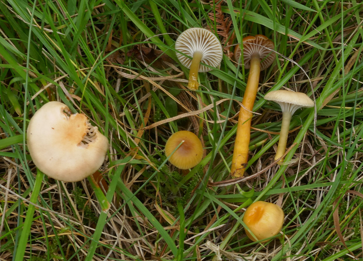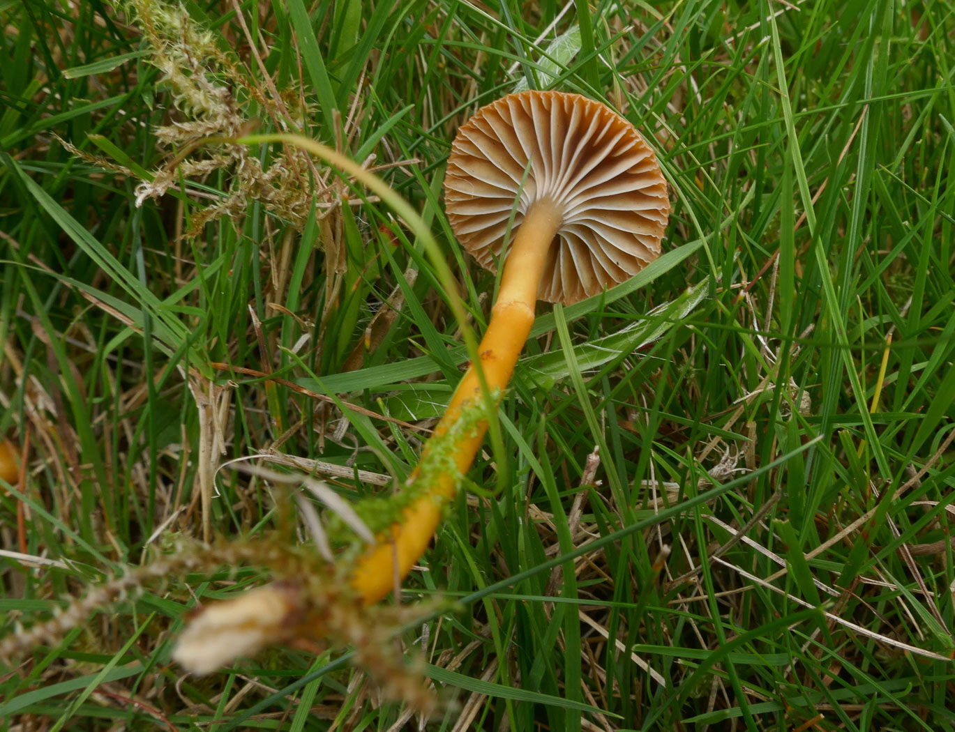 October 17th Gliophorus laetus (Heath Waxcap) At Stampwell Farm Jackie Ewan noticed this unusual waxcap making a brief appearance in its usual spot. Note the widely spaced decurrent gills which uniquely have a fine line of slime on the gill edge (not really visible) which with a pin one can separate from the gill in a stretchy strand. Previous finds |
