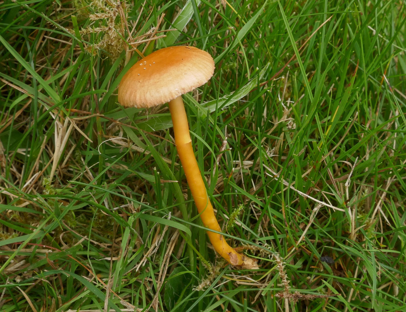 October 10th Hygrocybe chlorophana (Golden Waxcap) At Stampwell Farm Jackie Ewan noticed that waxcaps are now beginning to make an appearance though in a new area here where she's not seen them before. This common species was not as sticky as she was expecting due to the dry conditions, but the spores confirmed her iD. Previous finds |