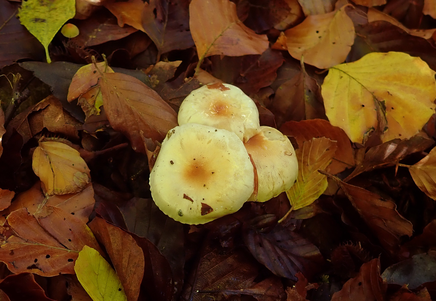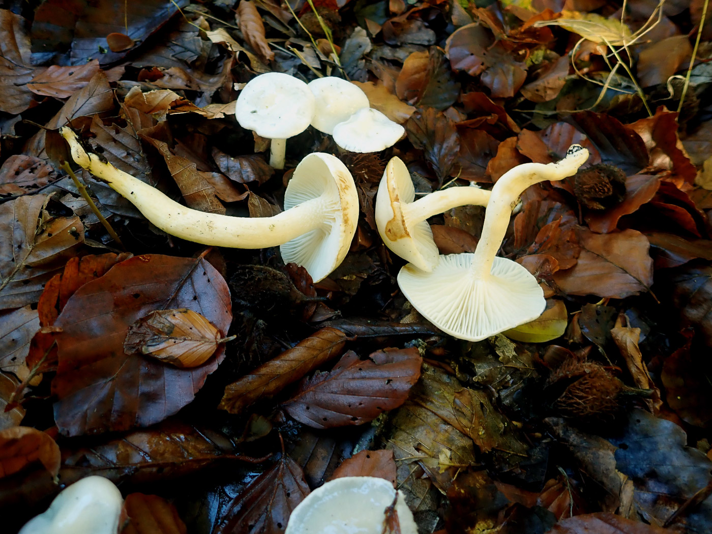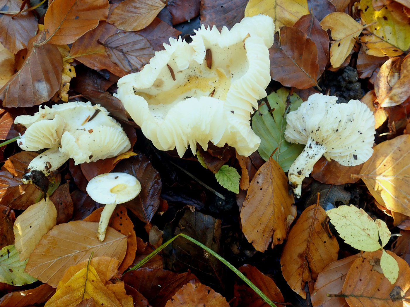 October 24th Hygrophorus discoxanthus (Yellowing Woodwax) There was a bumper crop of Woodwaxwes under Beech at Gussetts Wood today with 4 different species found by Penny and Paul. The white slimy capped ones were really plentiful and could only be separated with a drop of KOH on the cap: yellowish brown after a few seconds in H. discoxanthus but no change in H. eburneus (Ivory Woodwax). In fact as the caps were wet the KOH ran round the cap edges as can be seen in photo 1. Photo 2 shows a huge specimen with cap strongly upturned (but still the KOH test shows in the centre!) Previous finds |