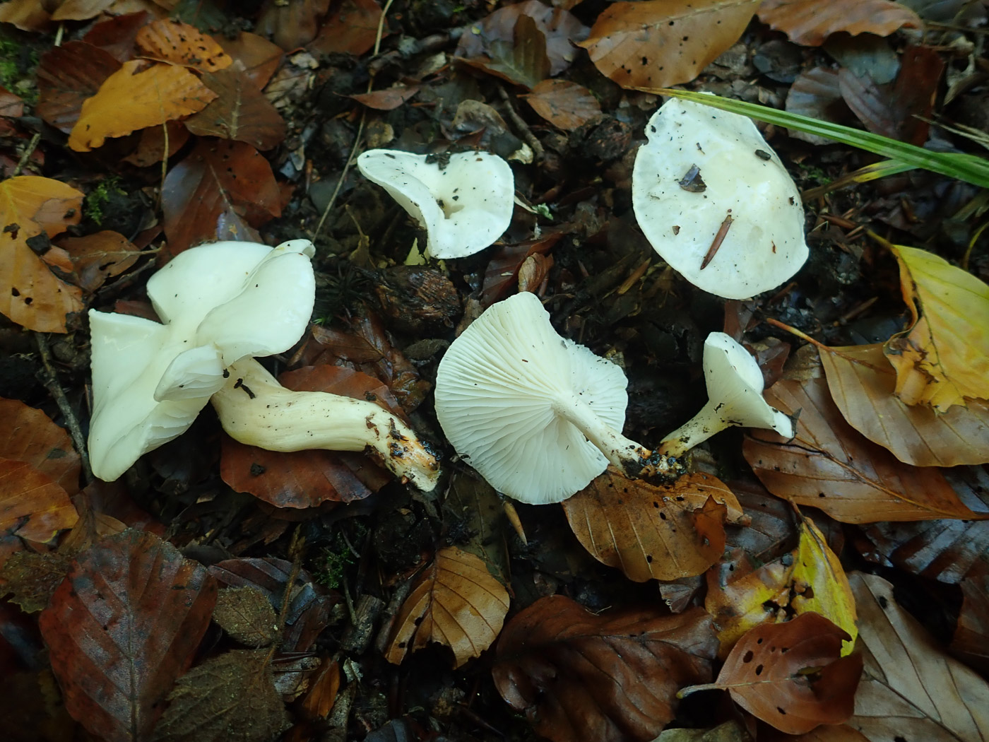 October 24th Hygrophorus eburneus (Ivory Woodwax) In Gussetts Wood under Beech this was one of four Woodwax species found by Penny and Paul. This one is considered the commonest of the white slimy members of the genus - host specific to Beech and having a cap with negative reaction to KOH in contrast to the identical H. discoxanthus (also found today) which turns quickly brown. However, a drop of KOH on the stem base of H. eburneus turns rusty orange red, as can just be seen here in the three upturned specimens. Previous finds |