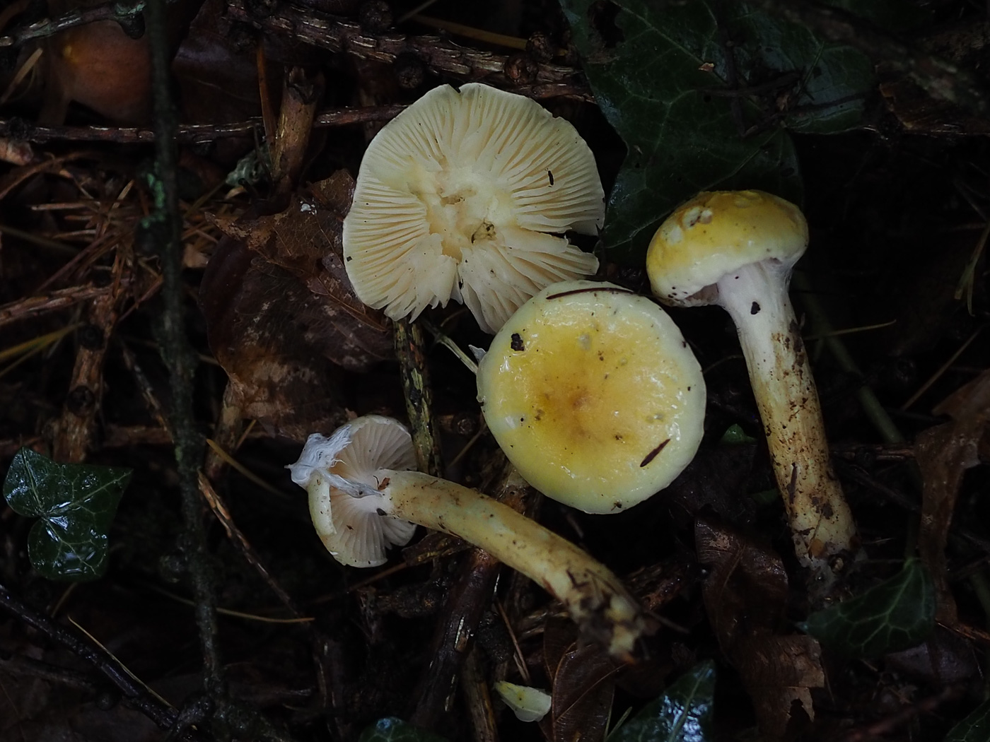 October 22nd Hygrophorus lucorum (Larch Woodwax) In Tinkers Wood where there is an area of Larch, John Catterson found this uncommon mushroom - host specific to that tree and often appearing late in the season. At first glance appearing something like a yellow-capped Russula, once collected the obvious sticky to viscid cap surface, rather distant and slightly decurrent gills plus a ring zone on the stem should be sufficient to eliminate that genus and identify it, given the presence of Larch of course. Previous finds |
