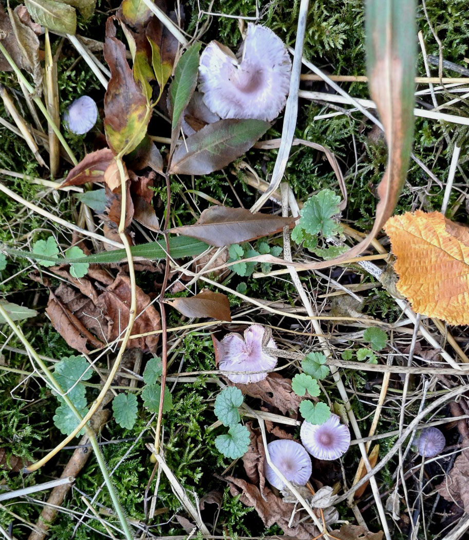 October 21st Mycena meliigena (Mauve Bonnet) On a thick mossy fallen Willow branch in Moorend Common some tiny little Bonnets were spotted, and though the light was poor and the specimens not very conveniently positioned, Penny suggested these were Mycena pseudocorticola (Steely Bonnet). Sarah Ebdon agreed with this but investigating further noticed that not all were showing the typical bluish glint of that species. Some were clearly pinker which promptly put her in mind of the rarer but very similar M. meliigena - a species she had long wanted to find and also known to fruit alongside M. pseudocorticola. At home a scope confirmed her ID though the two species are very similar with only subtle differences in microscopic detail. This is new to the county and a really nice find - not a species Penny has knowingly seen before, and a lesson in careful observation too! Photo 4 shows both species together for comparison: left is M. pseudocorticola and right is M. meliigena. New find |