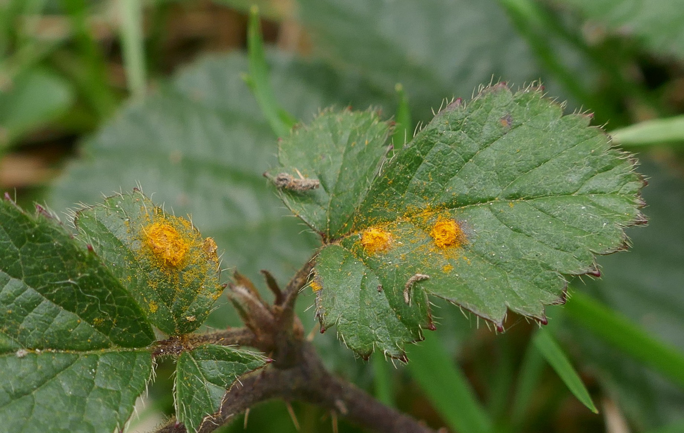October 17th Kuehneola uredinis (Pale Bramble Rust) On some Bramble leaves at Stampwell Farm Jackie Ewan noticed these rusty patches and took them home to identify, eventually tracking it down to this species which is a common sight on Bramble stems in Spring but this appears to be the aecial stage, occurring on the same host but at this later time of year. We have many records from April to June when on stems but none from later in the year than that on leaves as here. Previous finds |