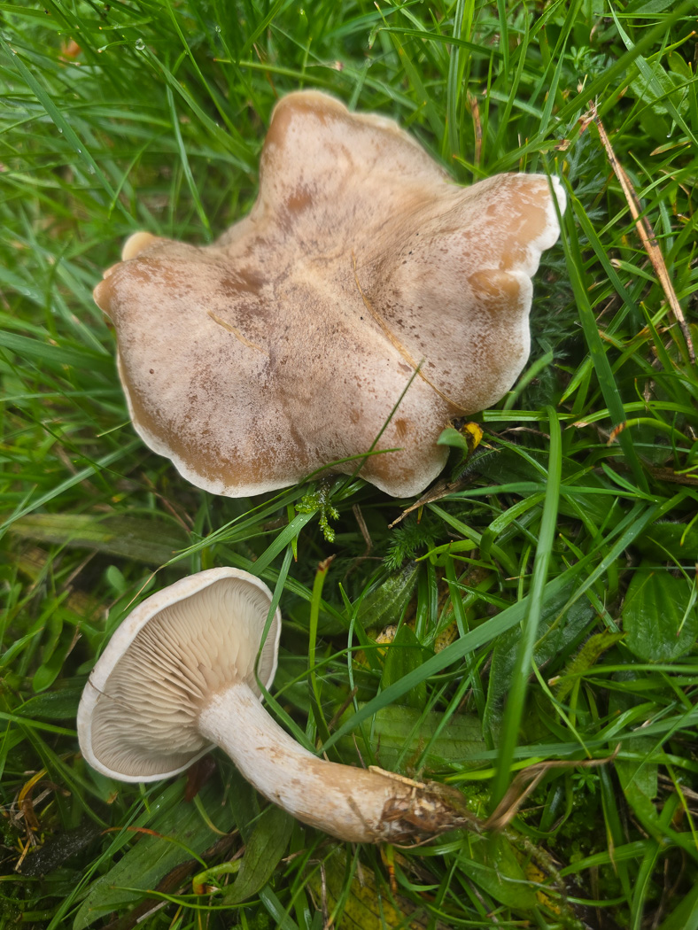 May 6th Entoloma clypeatum (Shield Pinkgill) At Stampwell Farm Jackie Ewan was please to find this species beginning to fruit under the Plum suckers in a grassy spot where she's found it for several years at this time. This is quite a sizeable Pinkgill which favours Prunus and occurs in late spring so its timing is spot on here. Note how one of the caps looks unusually broken up and cracked making it more like perhaps an Agrocybe - no doubt as a result of exposure to the hot sun. Previous finds |