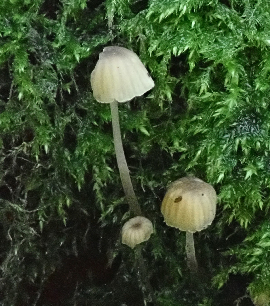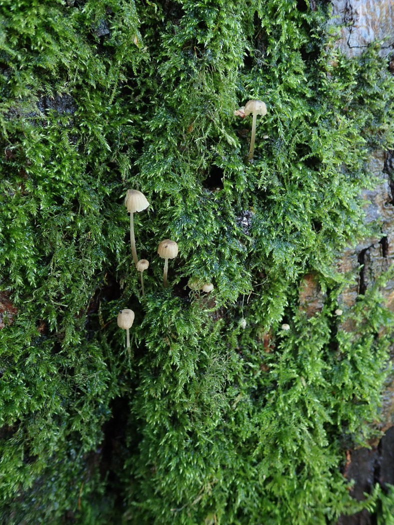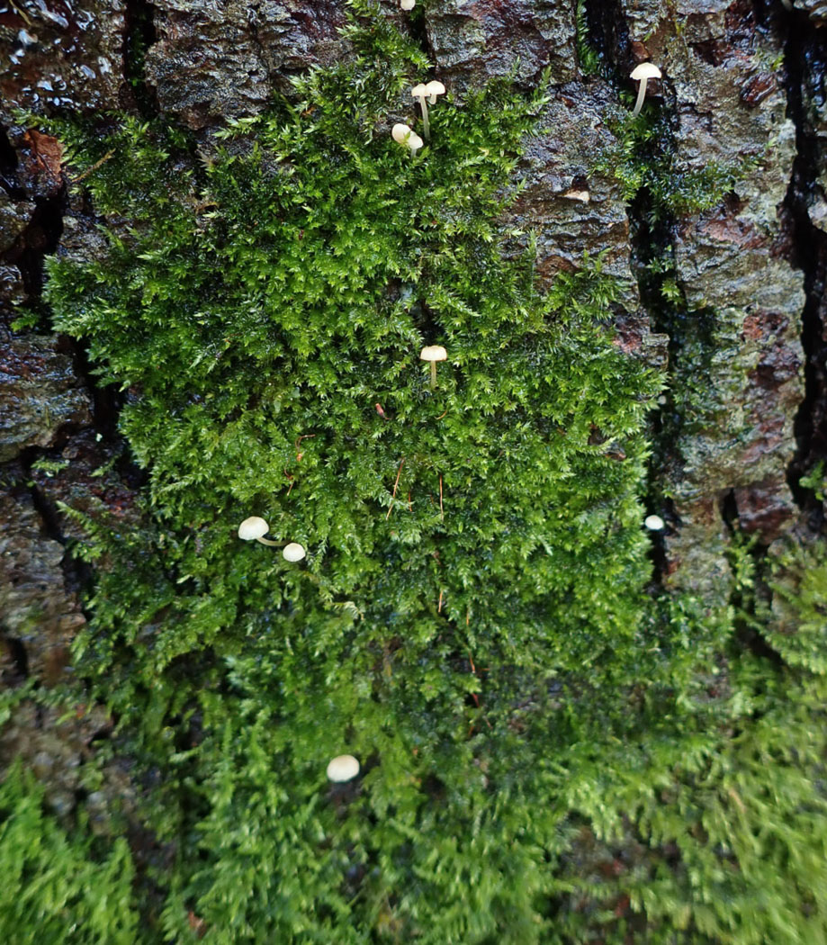 At Turville Heath Penny checked many of the mature mossy trunks in the Lime avenue, quite a few of which revealed an astonishing number of tiny Bonnets at eye level in the moss. New to the site was Mycena pseudocorticola (Steely Bonnet) which seems to be having a bonanza this autumn (no photos here but we have plenty of excellent photos already in Finds). She checked for but failed to find the sister species M. meliigena (Mauve Bonnet) which we've seen several times recently accompanying the blue-capped species, but she did find two other tiny Bonnets of note sharing this habitat: Phloeomana speirea (Bark Bonnet) and Phloeomana hiemalis seen here (both having recently moved genus from Mycena). Both are pale off-white though the much rarer P. hiemalis lacks the prominent brown central dot in the cap and the decurrent gills of P. speirea - a species we record quite regularly, though the safest way to separate them is to check the microcharacters. P. hiemalis stays tiny and really favours mossy live trunks as here and tends to be found in swarms, whereas P. speirea is regularly in ones or twos on fallen wood, deciduous sticks and can also be bigger but can also frequent mossy trunks as here.