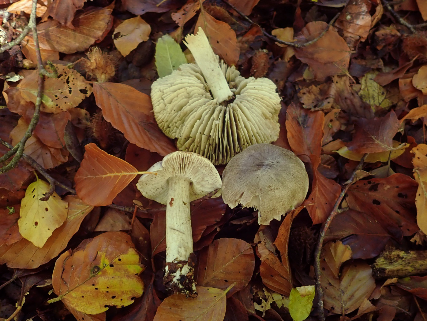 October 13th Tricholoma basirubens (a rare Knight with no English name) In Beech woodland near Stokenchurch Jackie Newcombe found these dark grey capped Knights, recalling that she'd found them here in the past but had been stumped for an ID. She noted, however, some rose pink staining at the stem base which out her in mind of Tricholoma basirubens, then sent her photos to Penny for her thoughts. As it happened, two days later in Dancersend Reserve on our BFG walk we had found this same rare species, the photo of which is included in the report. With red staining developing at the stem base and a dark grey scaly cap there is not really any other species of Tricholoma it can be, though it is worth noting that the red staining is not always obvious in the field and can take overnight at home to show up. If you notice blue staining in place of red, then you have T. orirubens with is less rare though both species favour Beech woodland. We now have 4 county records for this species. (Incidentally the fuzzy white mesh visible under the gills in photo 2 is not part of the Tricholoma but of some Hypomycete fungus busy accelerating the decomposition process.) New find |