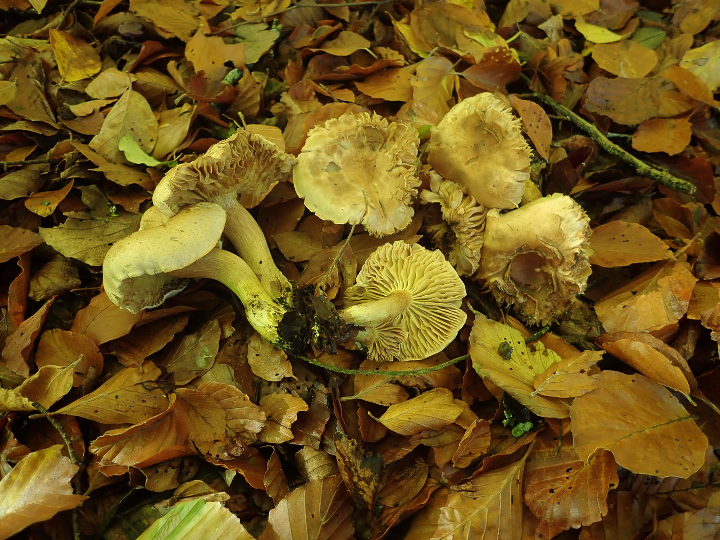 October 24th Tricholoma sulphureum (Sulphur Knight) Under the Beeches in Gussetts Wood Penny came across several collections of Knight which confused her somewhat. The yellowish gills together with the unmistakeable pervasive smell of coal gas tar indicated T. suphureum, but the caps and stems were not yellow as expected but brown, more akin to those of the sister species T. hemisulphureum but that species only occurs under Dryas or Helianthemum in specialised 'downland' habitats. Was there another Knight this could possibly be? Answer, no, not really! It appears that the species is very variable in colour though brown caps like these is not often illustrated, also further DNA research may prove this to be a species complex. So a samples is dried for sequencing but it is more than likely to confirm this as T. sulphureum. See previous entries for comparison. Previous finds |