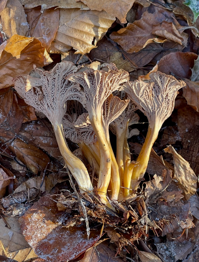 January 4th Craterellus tubaeformis (Trumpet Chanterelle) Our first find for 2026! Justin Long found these fruitbodies in Apsley Woods nr Milton Keynes, easily recognisable despite being completely frozen solid! The genus name may surprise a few here as this was previously in Cantharellus; it has also had several different English names including Yellowlegs (very apt) and Winter Chanterelle (also in this case apt) though it is certainly not restricted to fruiting at this time and is often to be found in good numbers during the autumn months. This is a mushroom which, if you come across one, there are nearly always more close by though they're usually surprisingly hard to see and you need to 'get your eye in' as the saying goes! Surprisingly, our previous Finds entry appears to be from 2023 because this is not a rarity. Previous finds |